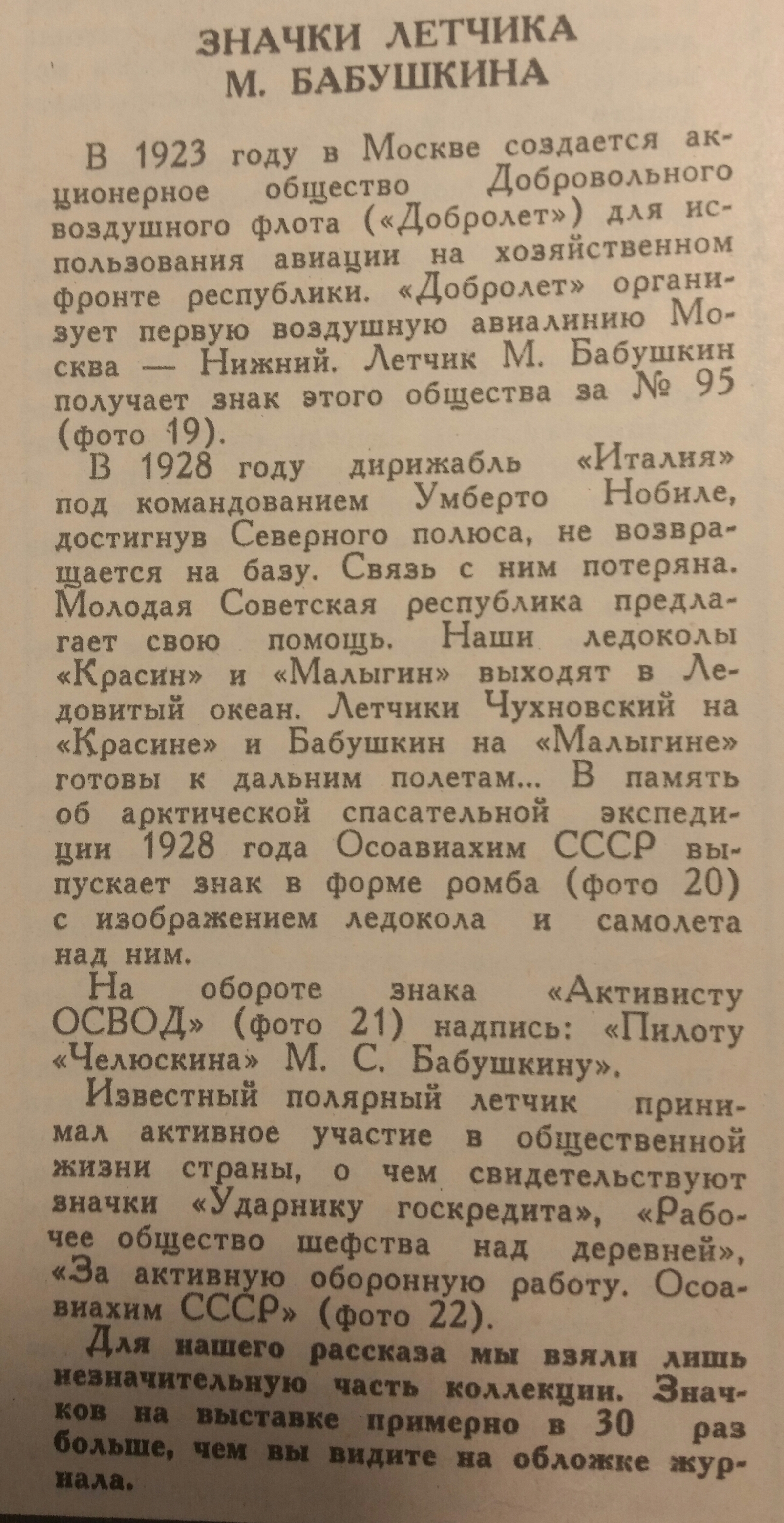 В 1923 году в Москве создается общество Добровольного воздушного флота (Добролет») для использования авиации на хозяйственном фронте республики. «Добролет» организует первую воздушную линию Москва – Нижний. Летчик М. Бабушкин получает знак этого общества за № 95 (фото 19).