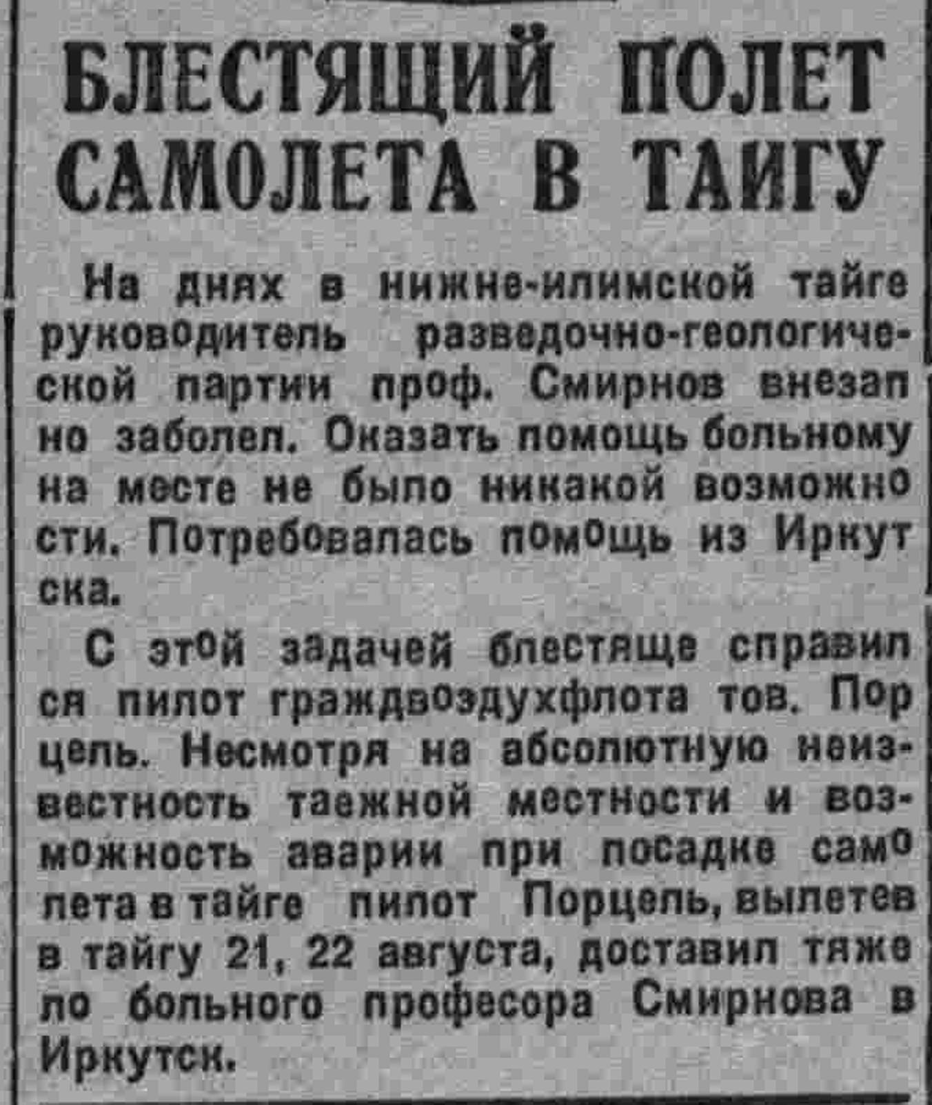 С этой задачей блестяще справился пилот граждвоздухфлота тов. Порцель. Несмотря на абсолютную неизвестность таежной местности и возможность аварии при посадке самолета в тайге пилот Порцель, вылетев в тайгу 21, 22 августа, доставил тяжело больного професора Смирнова в Иркутск.