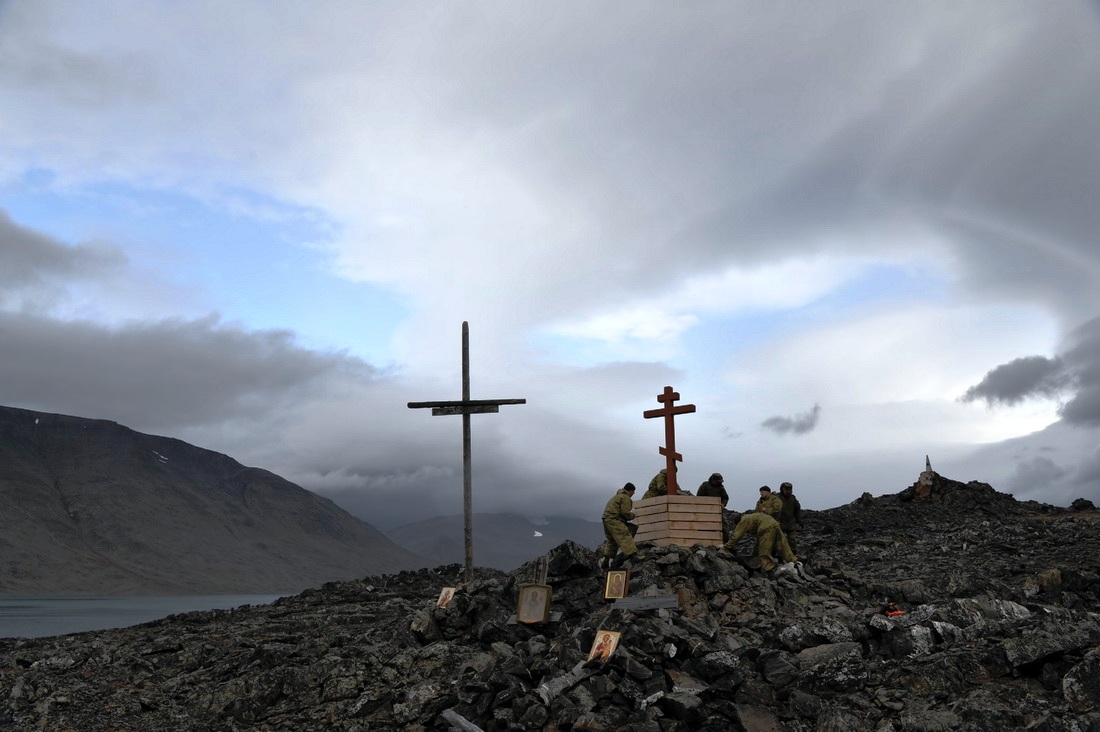 Владыка Иаков освятил крест, полковник Шуркалин дал команду юнармейцам приспустить флаги, а военнослужащие дали в небо несколько залпов из автоматов. Таким образом, были отданы и воинские почести героям русской Арктики.