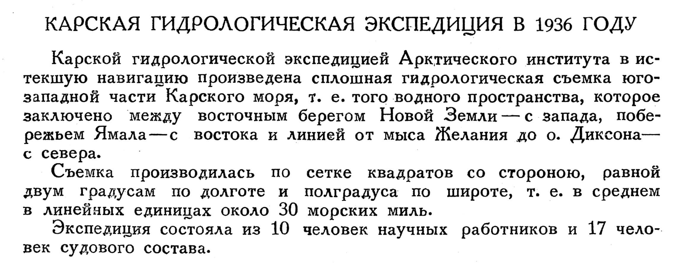 Карской гидрологической экспедицией Арктического института в истекшую навигацию произведена сплошная гидрологическая съемка юго-западной части Карского моря, т. е. того водного пространства, которое заключено между восточным берегом Новой Земли — с запада, побережьем Ямала — с востока и линией от мыса Желания до о. Диксона — с севера.