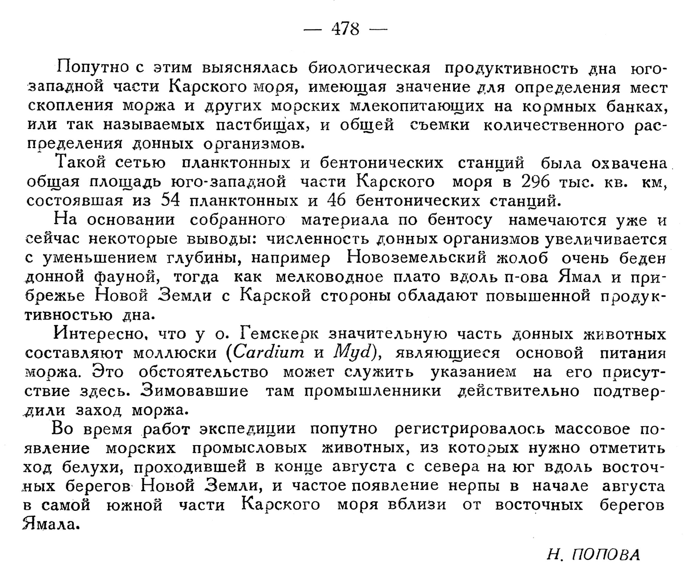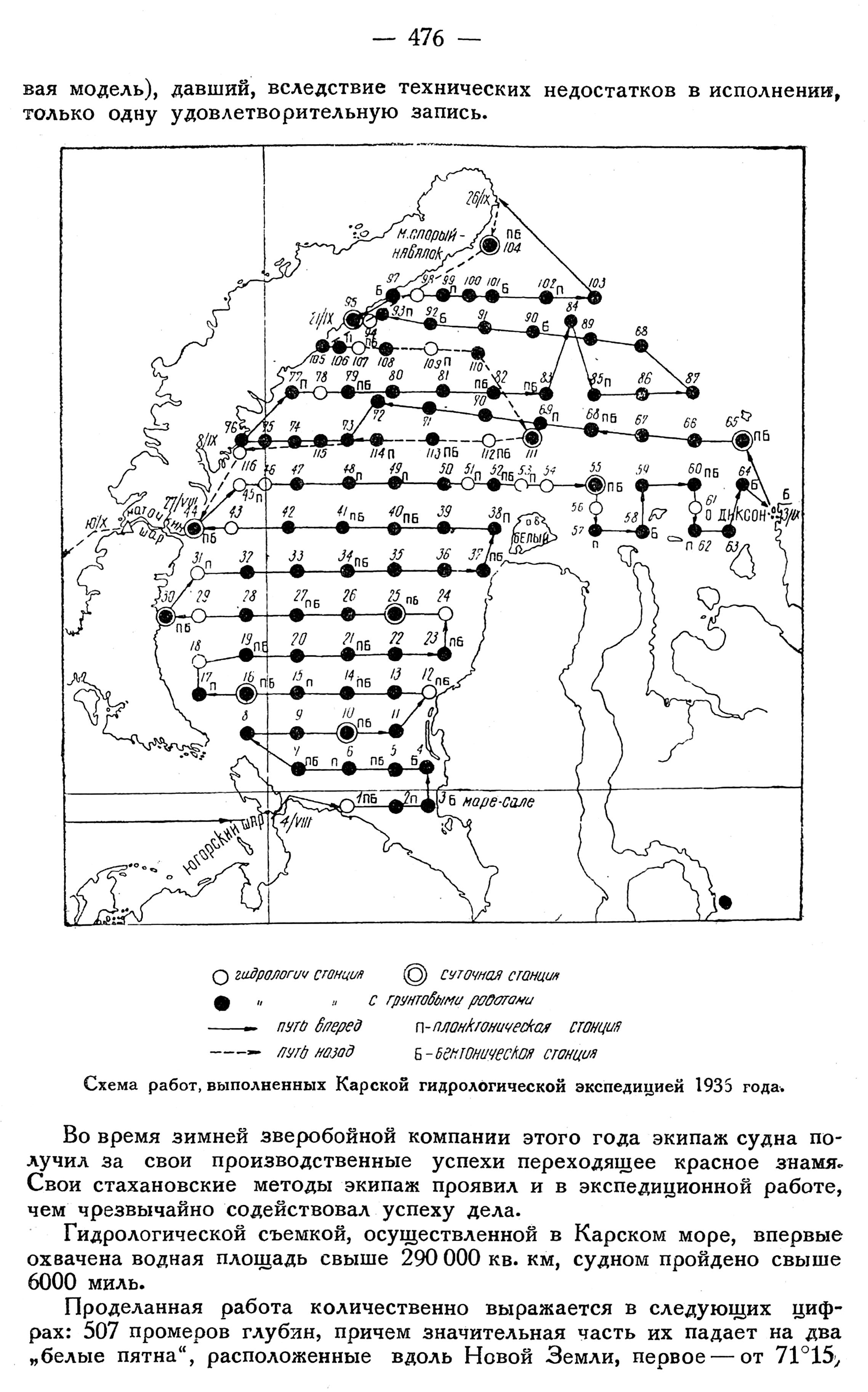 с. ш. до 72°15' с. ш. и второе — от 74°15' с. ш. до 75°15' с. ш.; 108 монолитов грунта, из которых многие свыше 100 см длины; 116 гидрологических станций, из них 10 суточных (точнее 26-часовых) с непрерывной регистрацией течений через каждый час и температуры и солености через каждые 2 часа. Взята 5901 проба воды на химический анализ, из них 30 проб на полный химический анализ; из отдельных химических компонентов на борту судна исследовались хлор, кислород, фосфаты, концентрация водородных ионов. Особое внимание было уделено выяснению химического влияния речного стока Оби и Енисея. По гидробиологическим сборам {1} взято 54 планктонных станции (причем на суточных станциях пробы брались дважды — один раз днем, другой раз ночью) и 46 бентонических станций. Серий метеорологических наблюдений было произведено свыше 400.