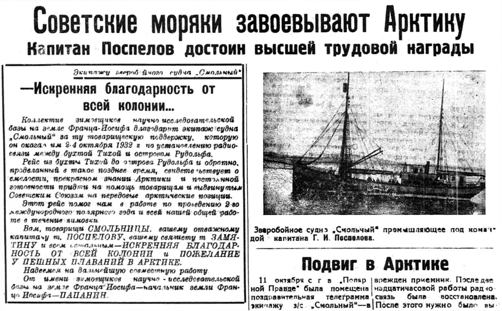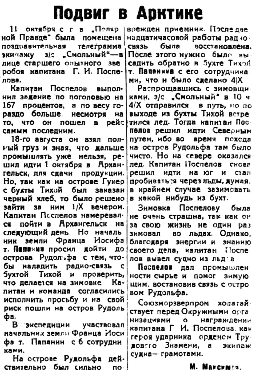 11 октября с. г. в "Полярной Правде" была помещена поздравительная телеграмма экипажу з/с "Смольный" — в лице старшего опытного зверобоя капитана Г. И. Поспелова.