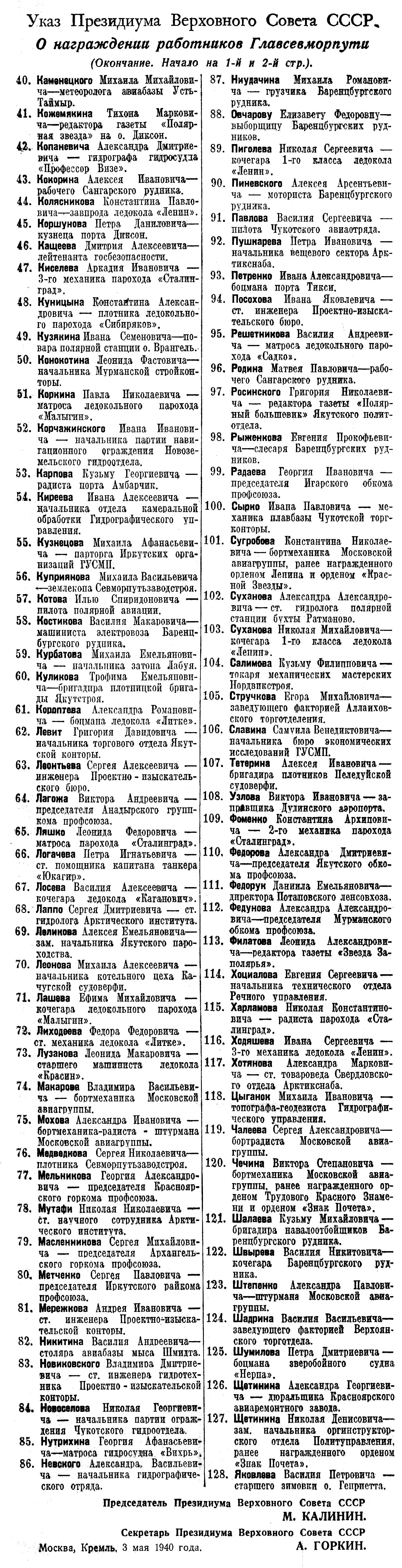 За выдающиеся заслуги в деле освоения Северного Морского Пути и районов Крайнего Севера, а также за образцовую и самоотверженную работу в период арктических навигаций 1938 и 1939 годов наградить: