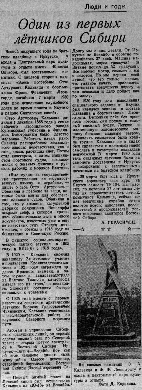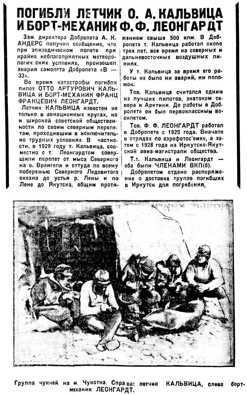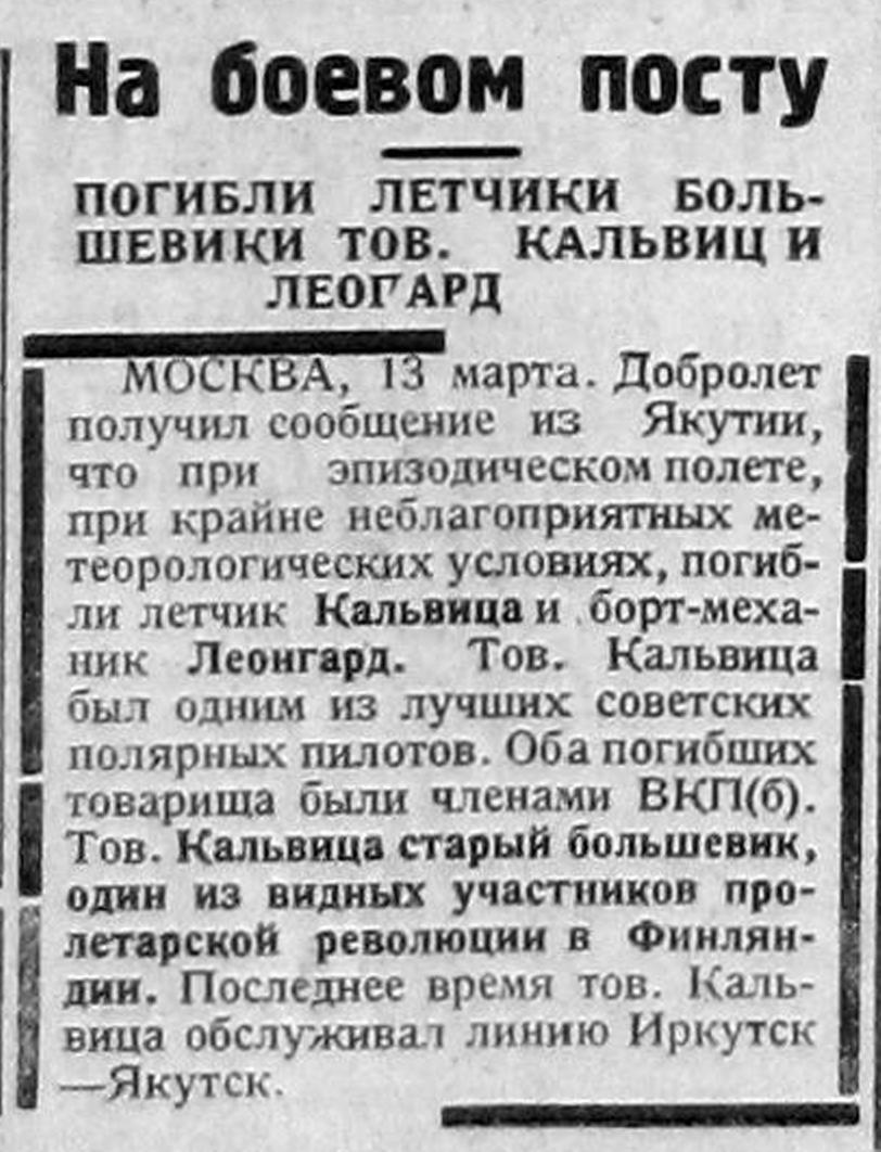 МОСКВА, 13. (Тасс). В Якутии при полете при крайне неблагоприятной погоде погибли лётчик Кальвиц и бортмеханик Леонгард. Кальвиц был одним из лучших советских полярных пилотов, в последнее время обслуживал линию Иркутск - Якутск. Оба погибших — члены ВКП(б).