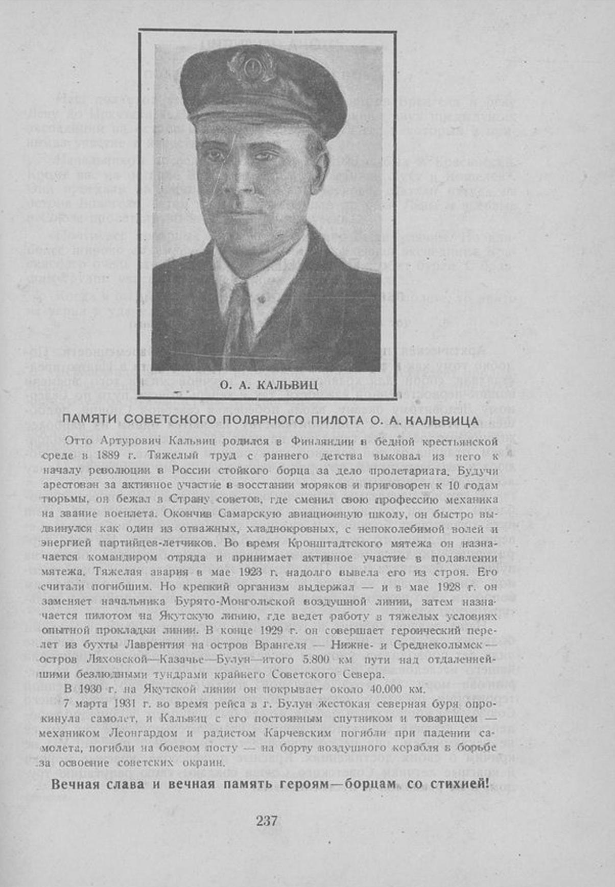 Отто Артурович Кальвиц родился в Финляндии в бедной крестьянской среде в 1889 г. Тяжелый труд с раннего детства выковал из него к началу революции в России стойкого борца за дело пролетариата. Будучи арестован за активное участие в восстании моряков и приговорен к 10 годам тюрьмы, он бежал в Страну советов, где сменил свою профессию механика на звание военлета. Окончив Самарскую авиационную школу, он быстро выдвинулся как один из отважных, хладнокровных, с непоколебимой волей и энергией партийцев-летчиков. Во время Кронштадтского мятежа он назначается командиром отряда и принимает активное участие в подавлении мятежа. Тяжелая авария в мае 1923 г. надолго вывела его из строя. Его считали погибшим. Но крепкий организм выдержал — и в мае 1928 г. он заменяет начальника Бурято-Монгольской воздушной линии, затем назначается пилотом на Якутскую линию, где ведет работу в тяжелых условиях опытной прокладки линии. В конце 1929 г. он совершает героический перелет из бухты Лаврентия на остров Врангеля Нижне- и Среднеколымск — остров Ляховской — Казачье — Булун — итого 5.800 км пути над отдаленнейшими безлюдными тундрами крайнего Советского Севера.