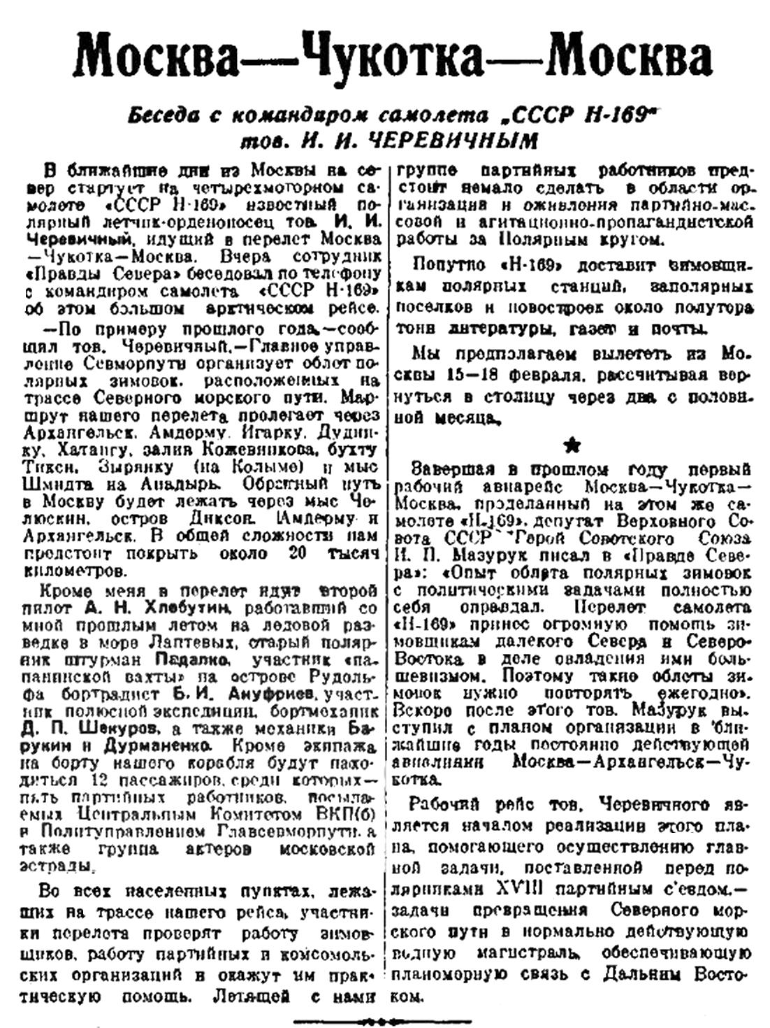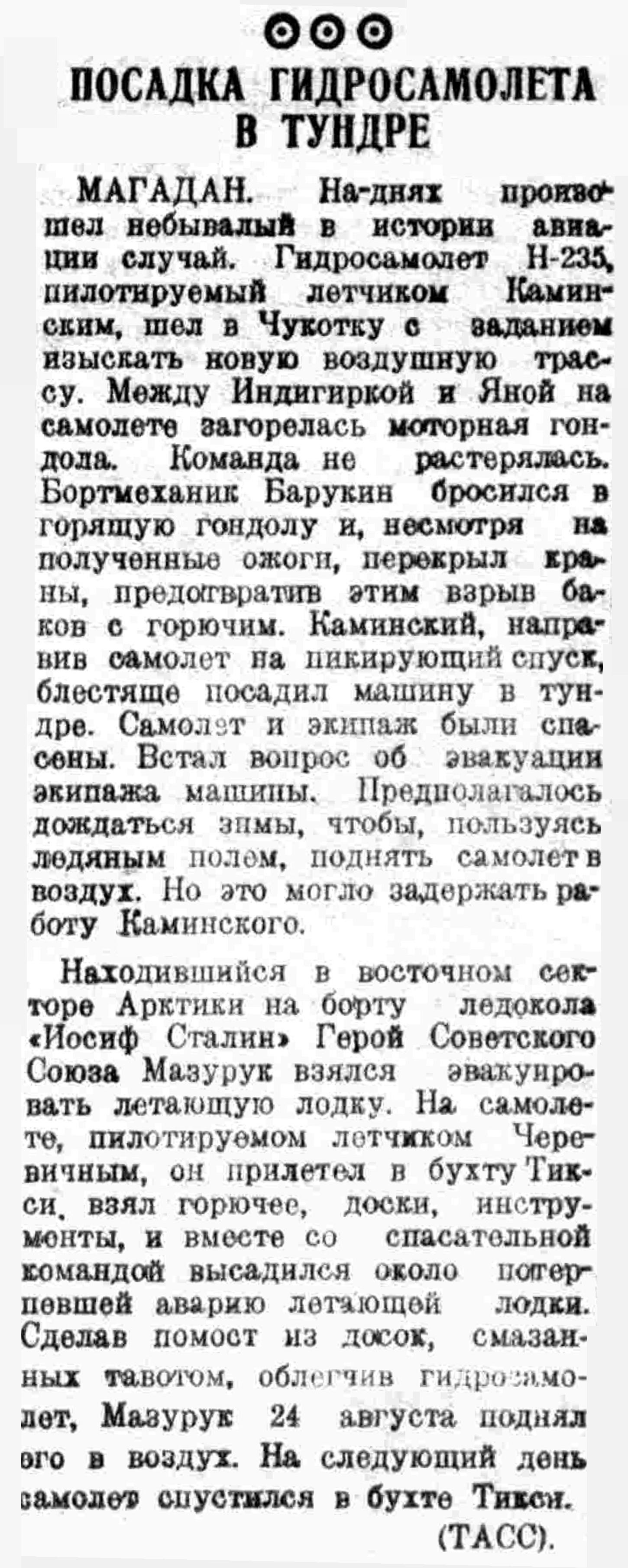 МАГАДАН. На-днях произошел небывалый в истории авиации случай. Гидросамолет Н-235, пилотируемый летчиком Каминским, шел в Чукотку с заданием изыскать новую воздушную трассу. Между Индигиркой и Яной на самолете загорелась моторная гондола. Команда не растерялась. Бортмеханик Барукин бросился в горящую гондолу и, несмотря на полученные ожоги, перекрыл краны, предотвратив этим взрыв баков с горючим. Каминский, направив самолет на пикирующий спуск, блестяще посадил машину в тундре. Самолет и экипаж были спасены. Встал вопрос об эвакуации экипажа машины. Предполагалось дождаться зимы, чтобы, пользуясь ледяным полем, поднять самолет в воздух. Но это могло задержать работу Каминского.