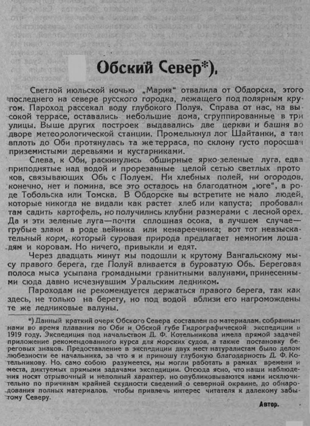 Данный краткий очерк Обского Севера составлен по материалам, собранным нами во время плавания по Оби и Обской губе Гидрографической экспедиции и 1919 году. Экспедиция под начальством Д. Ф. Котельникова имела прямой задачей приложение рекомендованного курса для морских судов, а также постановку береговых знаков. Предоставление в экспедиции двух мест натуралистам было делом любезности ее начальника, за что я и приношу глубокую благодарность Д. Ф. Котельникову. Но, само собою разумеется, мы могли работать в рамках времени и места, диктуемых прямыми задачами экспедиции. Отсюда ясно, что наши наблюдения носят отрывочный и неполный характер, но опубликовываются нами исключительно по причинам крайней скудности сведений о северной окраине, до обнародования полных материалов, чтобы привлечь интерес читателя к далекому забытому Северу.Автор.