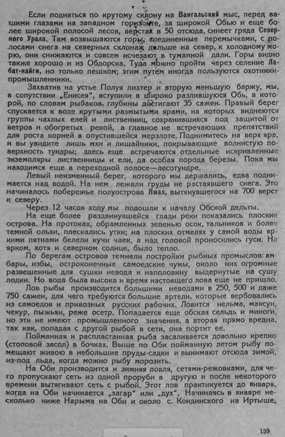 Слева, к Оби, раскинулись обширные ярко-зеленые луга, едва приподнятые над водой и прорезанные целой сетью светлых протоков, связывающих Обь с Полуем. Ни хлебных полей, ни огородов, конечно, нет и помина, все это осталось на благодатном „юге“, в роде Тобольска или Томска. В Обдорске вы встретите не мало людей, которые никогда не видали как растет хлеб или капуста; пробовали там садить картофель, но получились клубни размерами с лесной орех. Да и эти зеленые луга — почти сплошная осока, в лучшем случае — грубые злаки в роде вейника или кенареечника; вот тот невзыскательный корм, который суровая природа предлагает немногим лошадям и коровам. Но ничего, привыкли и едят.