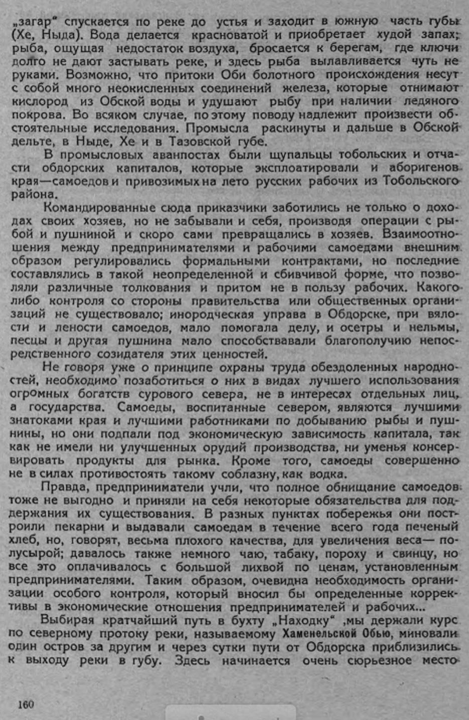 В промысловых аванпостах были щупальцы тобольских и отчасти обдорских капиталов, которые эксплоатировали и аборигенов края — самоедов и привозимых на лето русских рабочих из Тобольского района.