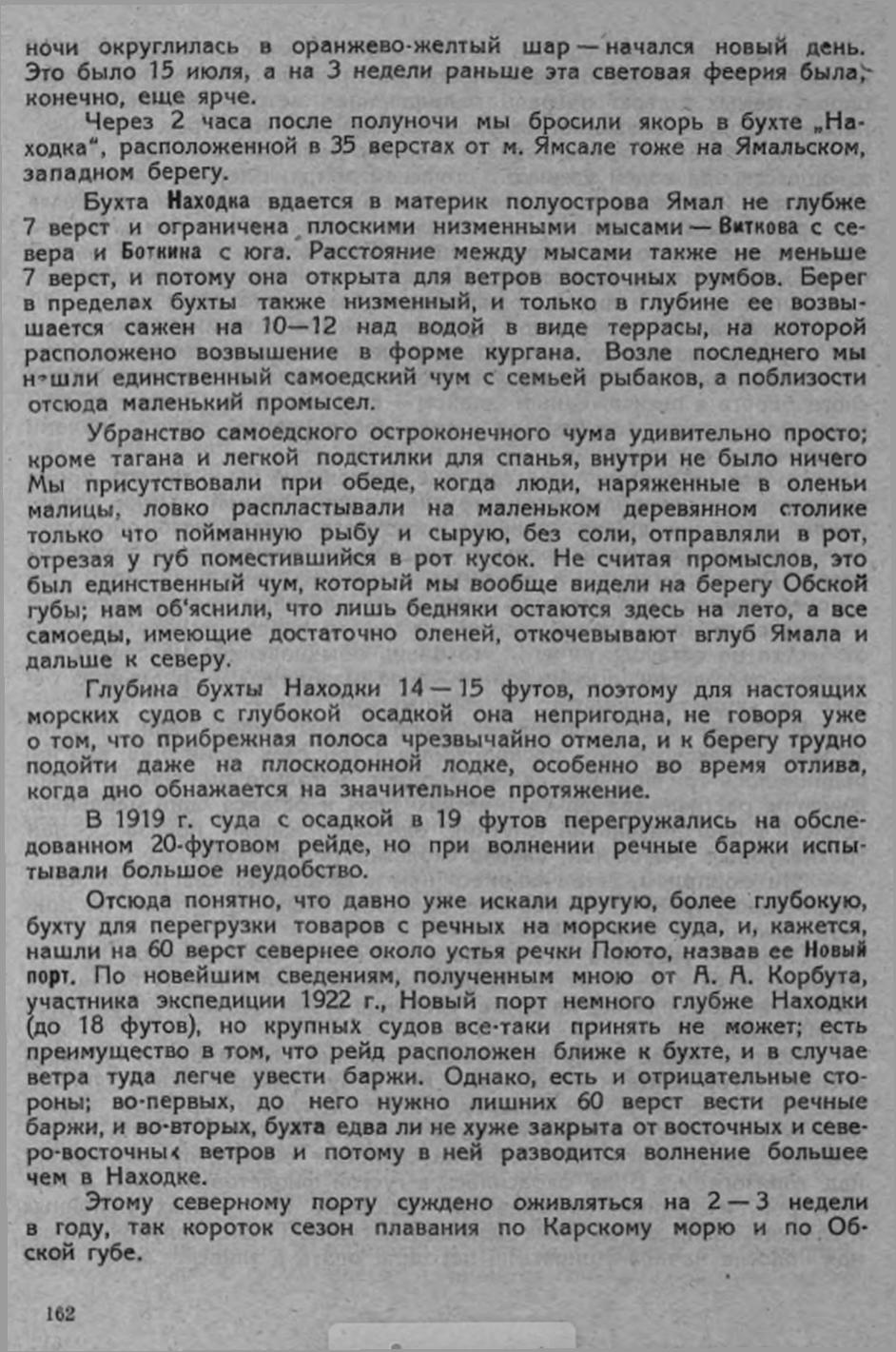 Отсюда понятно, что давно уже искали другую, более глубокую, бухту для перегрузки товаров с речных на морские суда, и, кажется, нашли на 60 верст севернее около устья речки Поюто, назвав ее Новый порт. По новейшим сведениям, полученным мною от А. Д. Корбута, участника экспедиции 1922 г., Новый порт немного глубже Находки (до 18 футов), но крупных судов все-таки принять не может; есть преимущество в том, что рейд расположен ближе к бухте, и в случае ветра туда легче увести баржи. Однако, есть и отрицательные стороны; во-первых, до него нужно лишних 60 верст вести речные баржи, и во-вторых, бухта едва ли не хуже закрыта от восточных и северо-восточных ветров и потому в ней разводится волнение большее чем в Находке.