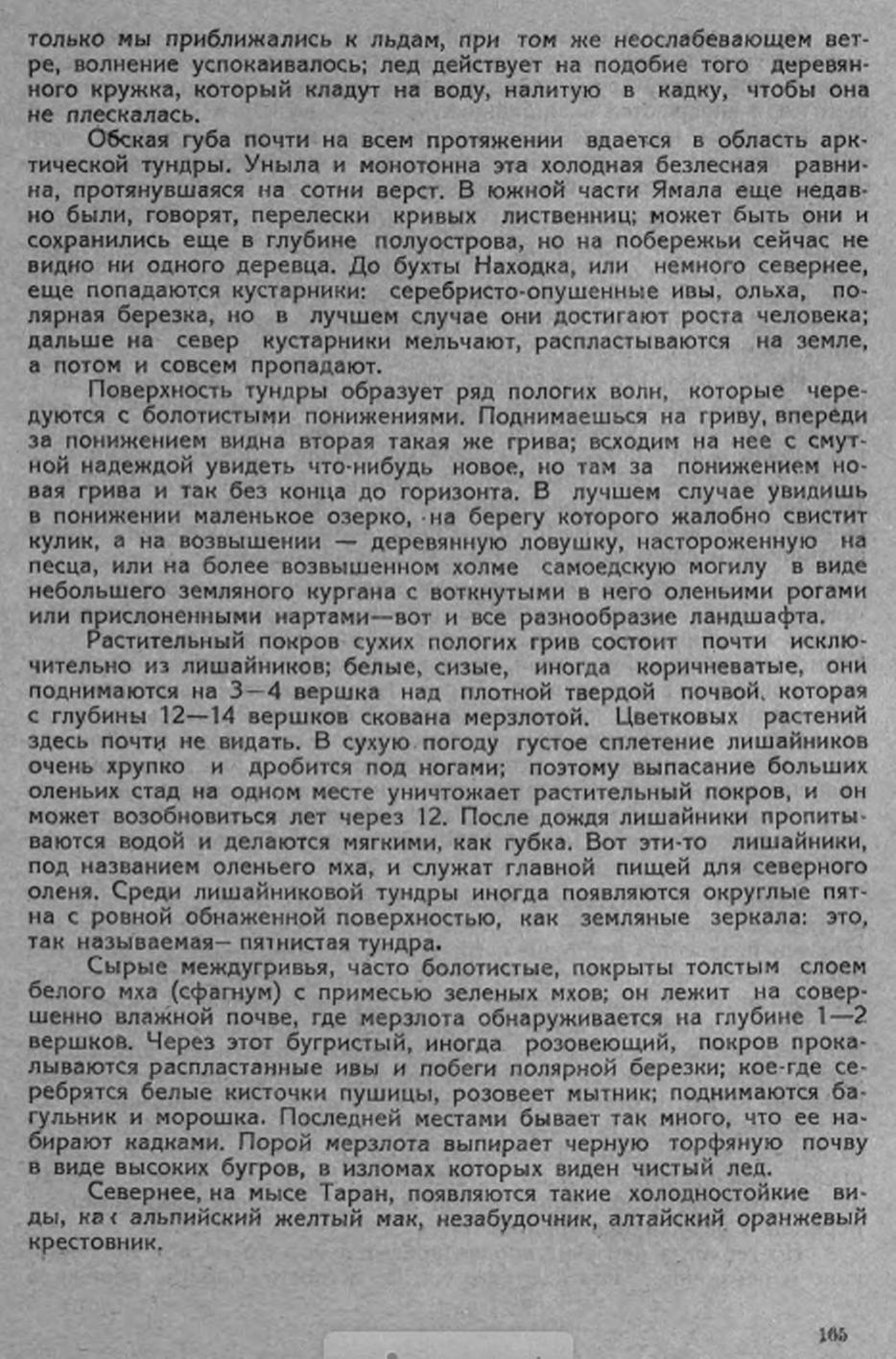 Обская губа почти на всем протяжении вдается в область арктической тундры. Уныла и монотонна эта холодная безлесная равнина, протянувшаяся на сотни верст. В южной части Ямала еще недавно были, говорят, перелески кривых лиственниц; может быть они и сохранились еще в глубине полуострова, но на побережьи сейчас не видно ни одного деревца. До бухты Находка, или немного севернее, еще попадаются кустарники: серебристо-опушенные ивы, ольха, полярная березка, но в лучшем случае они достигают роста человека; дальше на север кустарники мельчают, распластываются на земле, а потом и совсем пропадают.