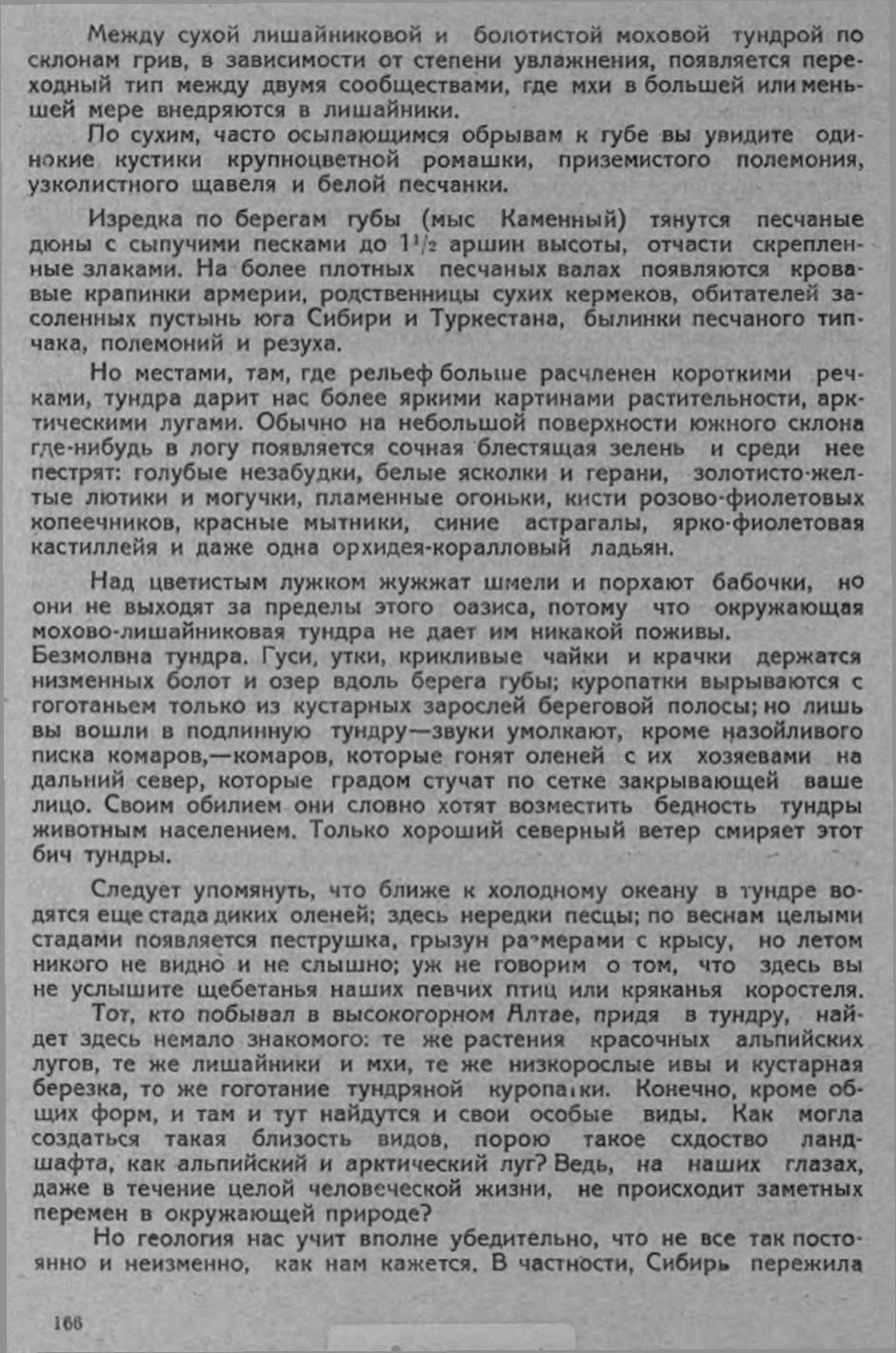 Тот, кто побывал в высокогорном Алтае, придя в тундру, найдет здесь немало знакомого: те же растения красочных альпийских лугов, те же лишайники и мхи, те же низкорослые ивы и кустарная березка, то же гоготание тундряной кypoпатки. Конечно, кроме общих форм, и там и туг найдутся и свои особые виды. Как могла создаться такая близость видов, порою такое сходство ландшафта, как альпийский и арктический луг? Ведь, на наших глазах, даже в течение целой человеческой жизни, не происходит заметных перемен в окружающей природе?