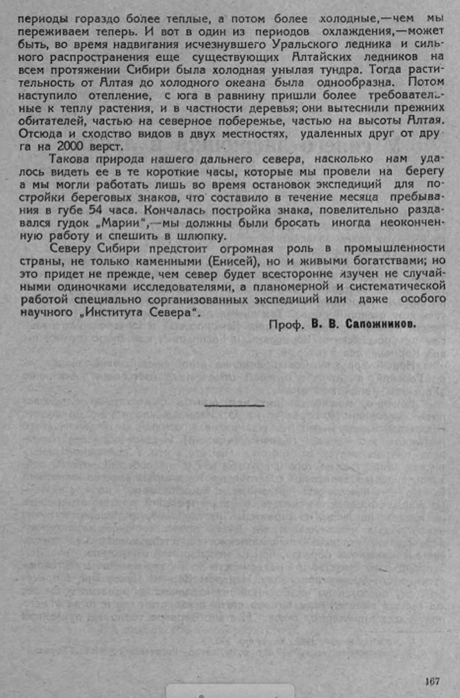 Северу Сибири предстоит огромная роль в промышленности страны, не только каменными (Енисей), но и живыми богатствами; но это придет не прежде, чем север будет всесторонне изучен не случайными одиночками исследователями, а планомерной и систематической работой специально сорганизованных экспедиций или даже особого научного „Института Севера".