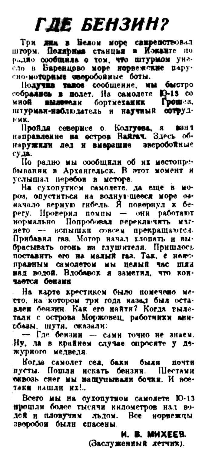 Сегодня из Москвы к Белому морю вылетает самолет Добролета под управлением летчика т. Михеева, имея на борту запасных летчика т. Лялина и борт-механиков гг. Алексеева и Монахова, а также радиста и аэро-фото-съемщика т. Сушэ.