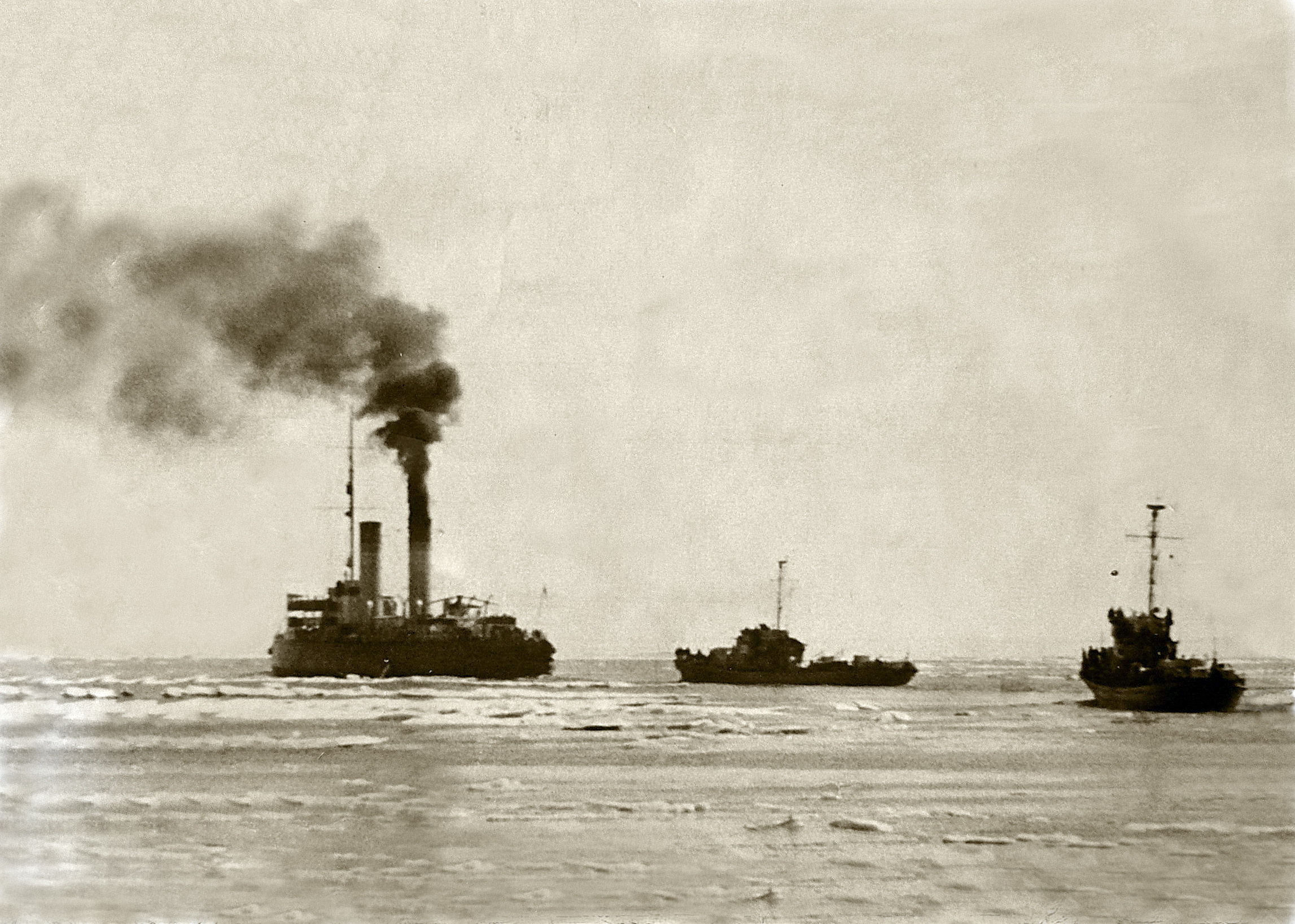 "Ермак" с Ми-1 Н-11 В.П.Колошенко на борту осуществляет проводку ЭОН-65 (47 вымпелов). За кормой ледокола 2 БО за ПЛ проекта 122 бис. Июль 1955 г.