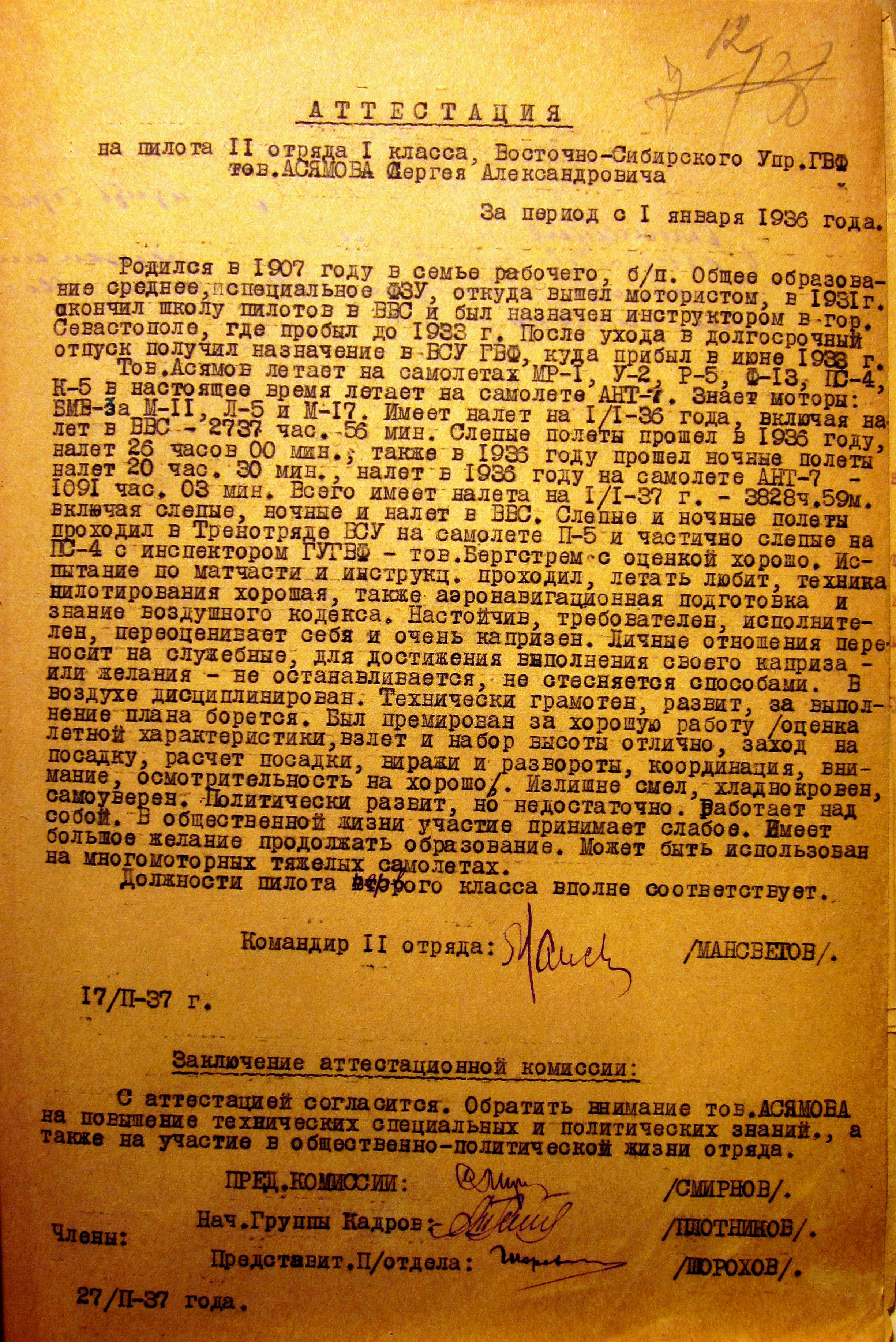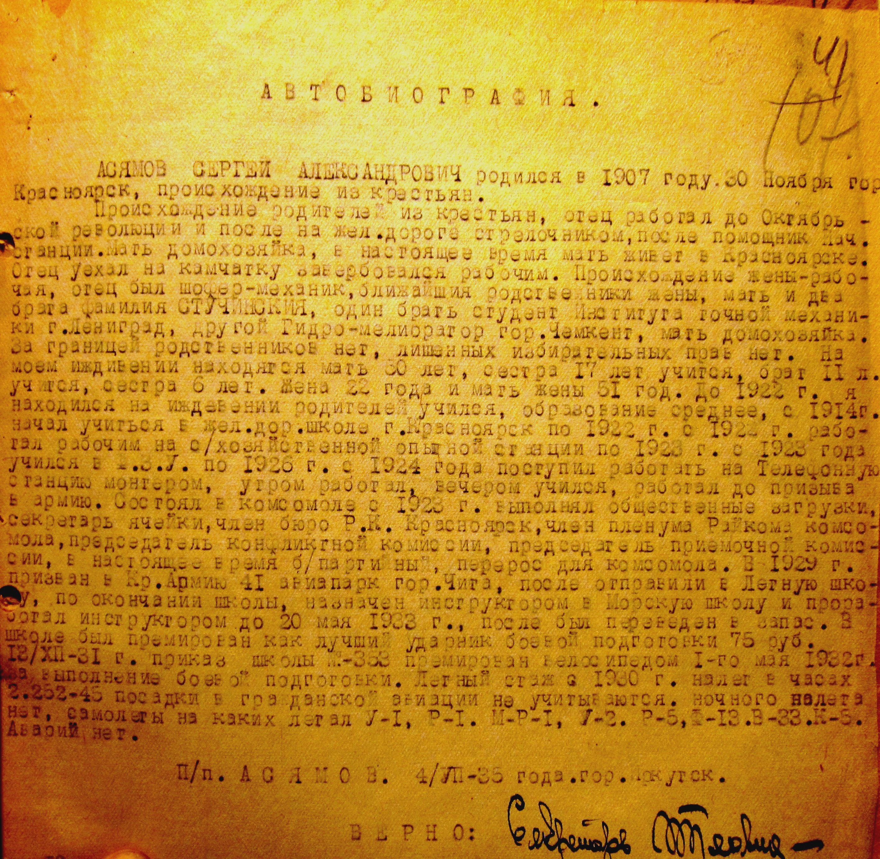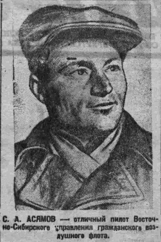 Тов. Асямов считается одним из лучших летчиков Bocточно-Сибирского управления Гражвоздухофлота. В течение целого года на самолете «Р-5» Сергей Александрович работал на линиях Иркутск — Красноярск и Иркутск — Могоча. На линии Улан-Удэ — Улан-Батор в 1934 году тов. Асямов праздновал свой первый юбилей — за два года он налетел 300 тысяч километров.