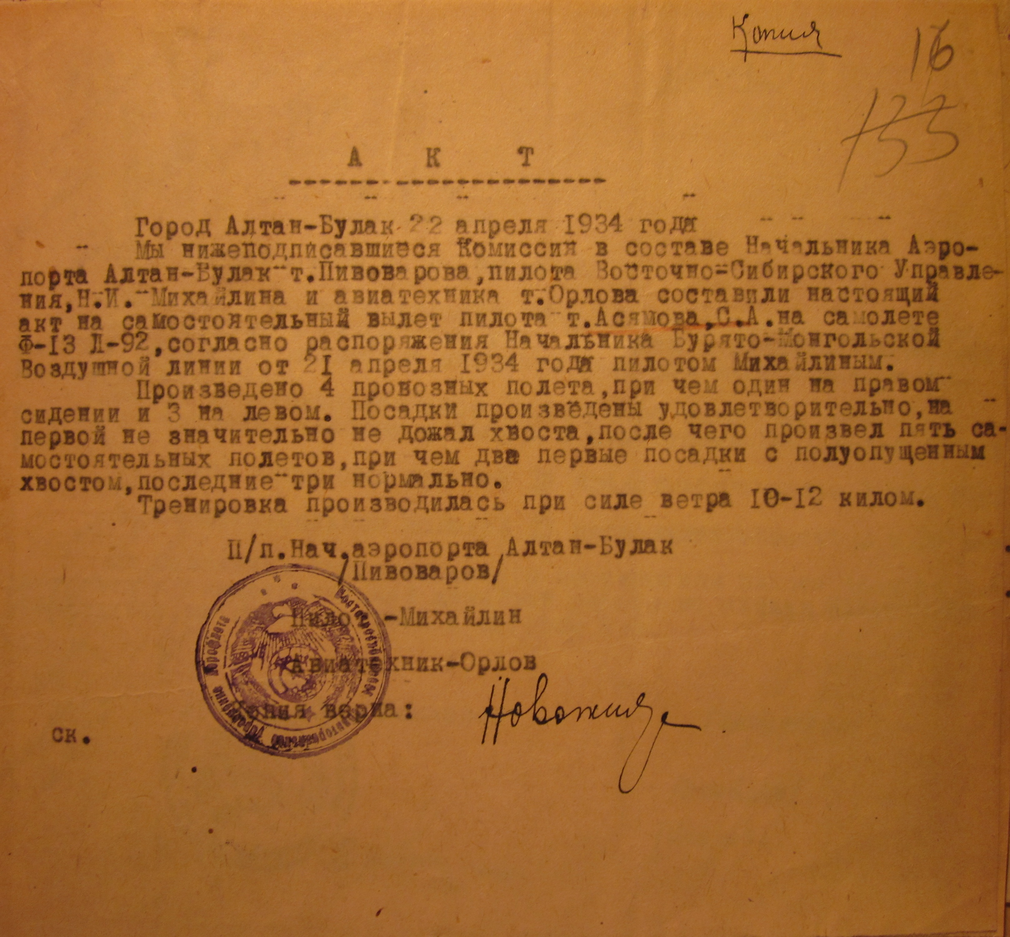 Был еще такой случай, когда на самолете «АНТ-7», управляемой пилотом Асямовым в первый рейс неожиданно перестал работать мотор. В воздухе исправить мотор невозможно. Среди высоких торосов льда Асямов нашел небольшую площадку и спланировал. Через несколько минут самолет уже с исправленным мотором продолжал свой путь.