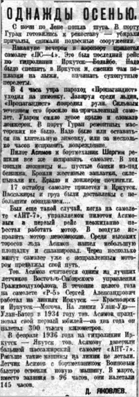 В феврале 1936 года на гидролинии Иркутск — Якутск тов. Асимову доверили большой пассажирский самолет «АНТ-7». Раньше такие машины на линии не летали. Летчик Асямов с бортмехаником Воиновым быстро освоили новую машину. В марте, вместо задания в 96 часов, они налетали 145 часов.