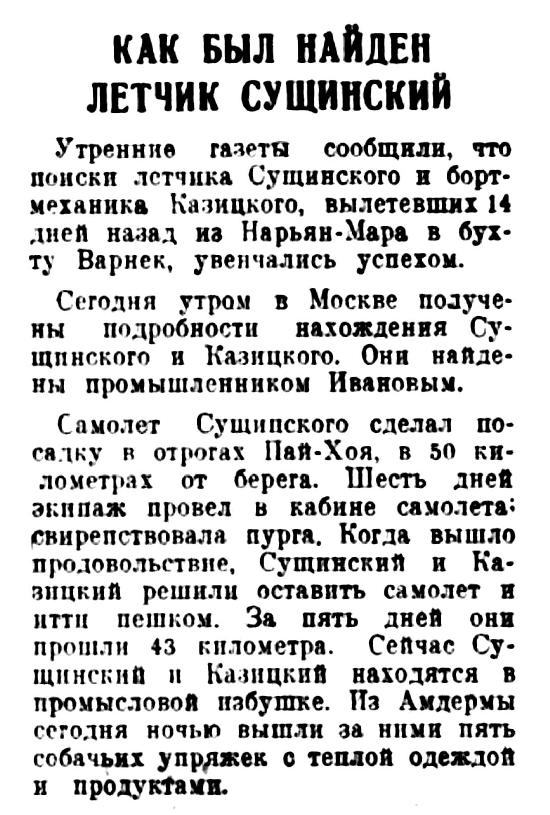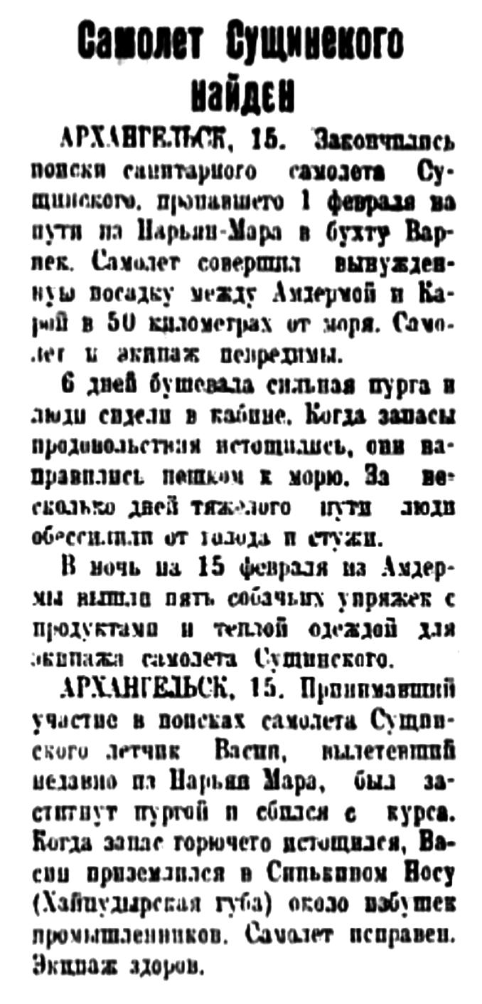 Утренние газете сообщили, что поиски летчика Сущинского и борт-механика Казицкого, вылетевших 14 дней назад из Нарьян-Мара в бухту Варнек, увенчались успехом.