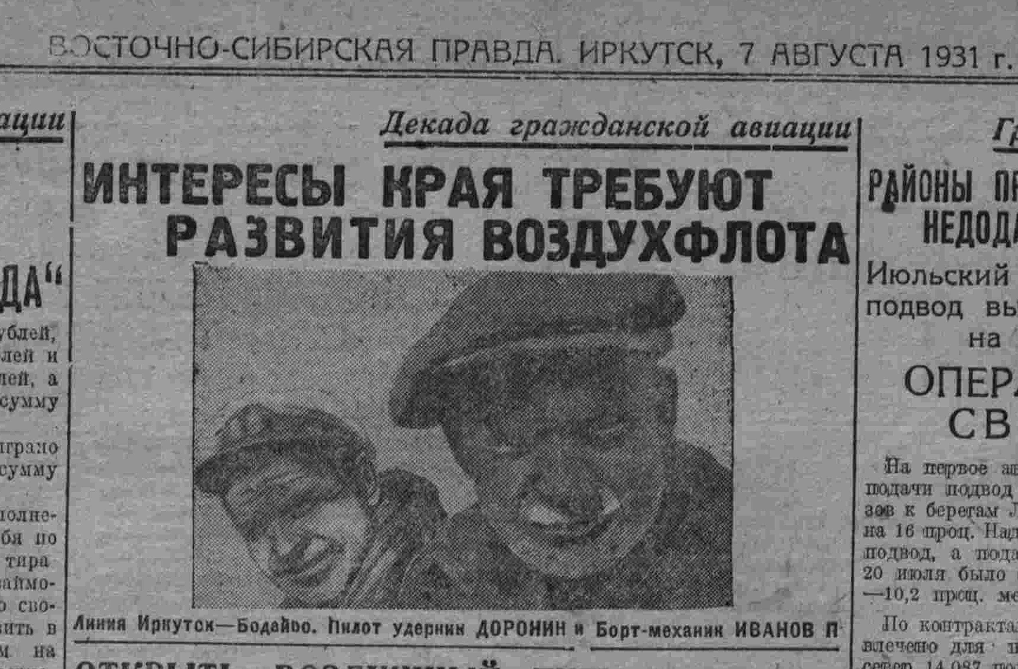 P.S. Изучая историю иркутской авиации, невольно задаешься вопросом: почему в Иркутске нет улиц с именами первопроходцев сибирских авиалиний, знаменитых летчиков, внесших особый вклад в историю города? Почему названная именем Доронина улица была переименована в Российскую? Что напоминает горожанам, и в первую очередь нашей молодежи, о подвигах иркутских летчиков при спасении челюскинцев.