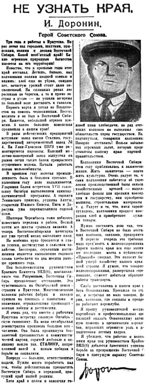 16 апреля 1934 года в нашей стране было учреждено звание Героя Советского Союза – высшая степень отличия за заслуги перед государством. 20 апреля иркутский пилот Иван Доронин был удостоен этого высокого звания. Ему еще не исполнился 31 год.