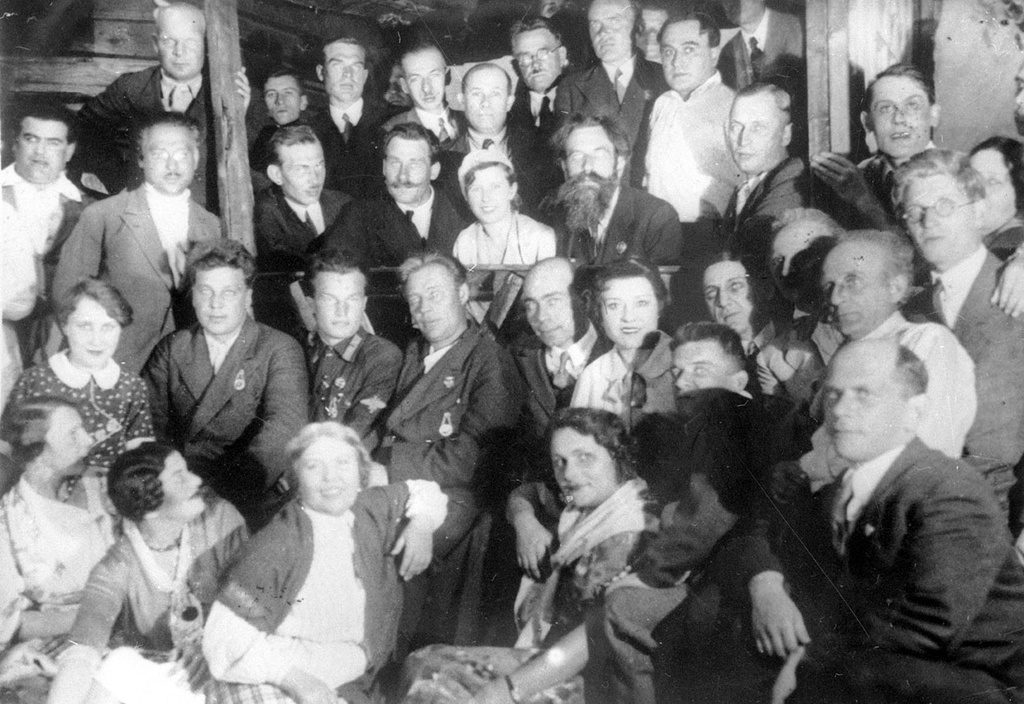 Челюскинцы в гостях у артистов театра «Сатира». Москва, 1934 г. Во втором ряду сидят лётчики - первые Герои Советского Союза: Н.П.Каманин (в центре, в форме), А.В.Ляпидевский (слева от него), В.С.Молоков (справа от него). В третьем ряду сидят: О.Ю.Шмидт - начальник ГУСМП (с бородой), лётчики М.Т.Слепнёв (справа от него) и Б.Г.Чухновский (третий слева от него). Стоят лётчики: первый слева - М.В.Доронин, третий - С.А.Леваневский.