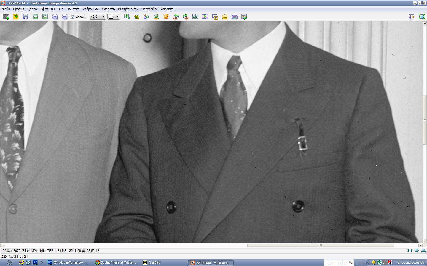 Скачал полноразмерный tiff. Существенный детализации не прибавилось, просто четко виден ремешок продетый в лацкан пиджака.