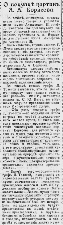 В сентябре 1897 г. П.М.Третьяков осмотрел новые работы художника и купил два больших полотна – «В области вечного льда. Лето» и «Весенняя полярная ночь». Высокое мастерство учеников А.И.Куинджи, и в частности А.А.Борисова, на академической выставке отмечалось критиками. Так В.В.Стасов писал: «Значительно лучше других, и даже очень отделяются от них, два пейзажа Борисова с далекого нашего Севера (особливо «Весенняя полярная ночь»)»[14]. .И.Е.Репин высоко оценил первые шаги художника: «Это все превосходные и верные, как зеркало, картинки, строго нарисованные и необыкновенно написанные. В них ярко выражена любовь этого русского Нансена к черной воде океана, с белыми льдинами, свежесть и глубина северных тонов, то мрачных, то озаренных резким светом низкого солнца. Горы, наполовину покрытые снегом во время самого жаркого лета, берега, дали, лодки, самоеды в оленьих шкурах и проч. предметы, – все это дышит у него особенной красотой Ледовитого моря и производит впечатление живой правды. Коллекцию его приобрел П.М.Третьяков для своей московской галереи»[15].