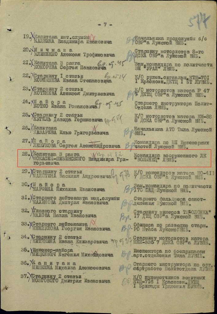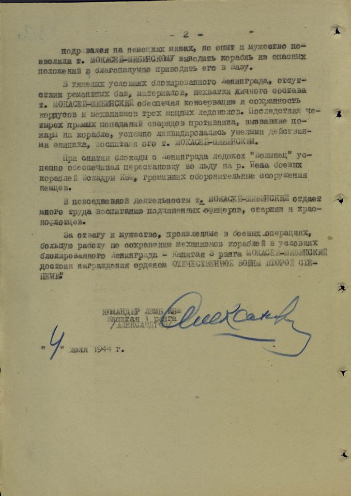 За отвагу и мужество, проявленные в боевых операциях, большую работу по сохранению механизмов кораблей в условиях блокированного Ленинграда - Капитан 3 ранга МОКАСЕЙ-ШИБИНСКИЙ достоин награждения орденом ОТЕЧЕСТВЕННОЙ ВОЙНЫ ВТОРОЙ СТЕПЕНИ.