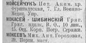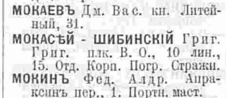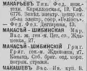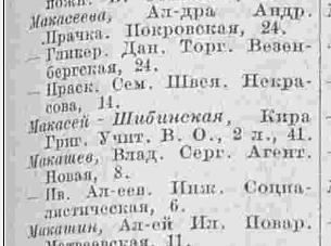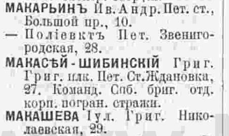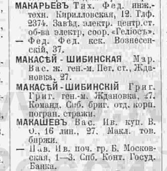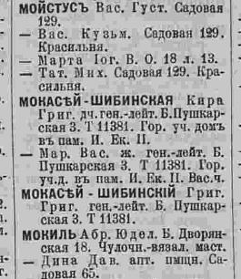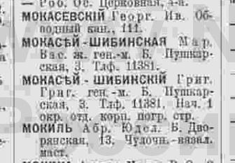 В книге 1923 года вновь появляется Кира Григорьевна М...-Шибинская, причем с двумя вариантами написания фамилии - Макасей и Мокасей, по адресу: В.О. 2-я линия, кв.41.