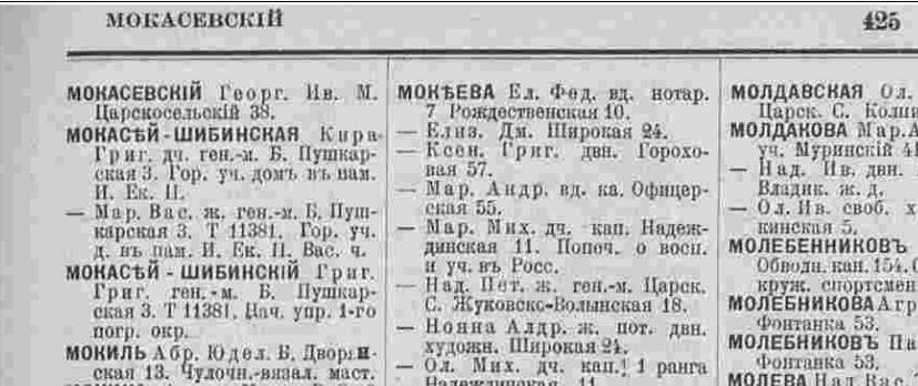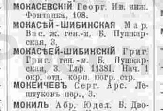 Мокасеи-Шибинские переехали на Б. Пушкарскую, д.3. Генерал-майор стал генерал-лейтенантом. Совместно с ними стала проживать дочь-Кира Григорьевна. Искомая особа - Владимир Григорьевич, так в справочнике и не проявился - служба, война, революция, наверное поэтому.