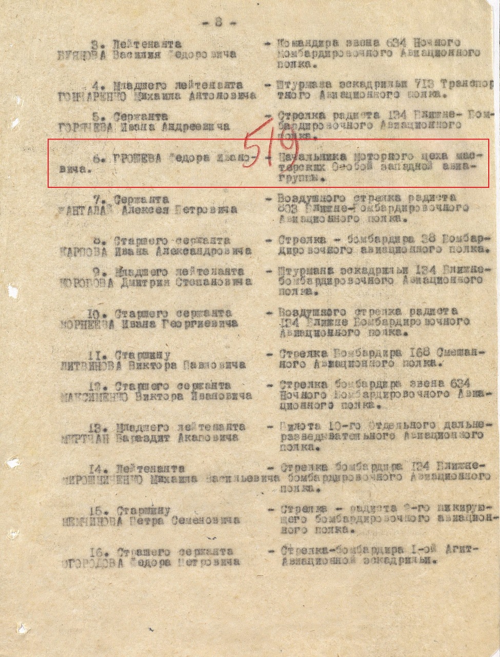 ... Придя в авиагруппу, тов. Грошев возглавил бригаду по ремонту моторов М-11. С исключительной энергией и умением, используя минимальные возможности, не считаясь со временем и отдыхом, тов. Грошев умело передавал опыт молодым кадрам. Под руководством тов. Грошева с каждым днем все больше восстанавливалось моторов.