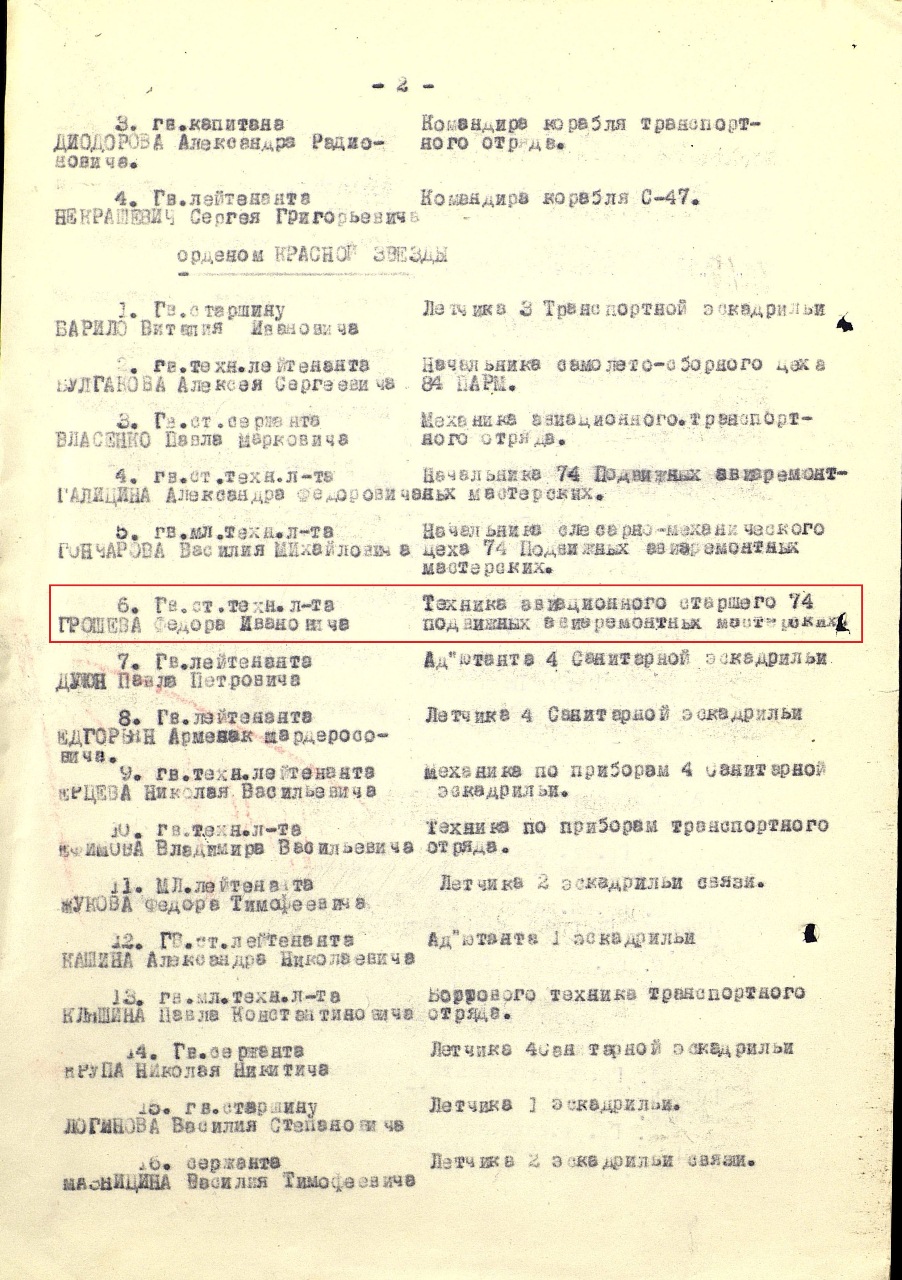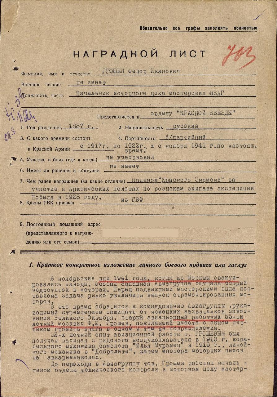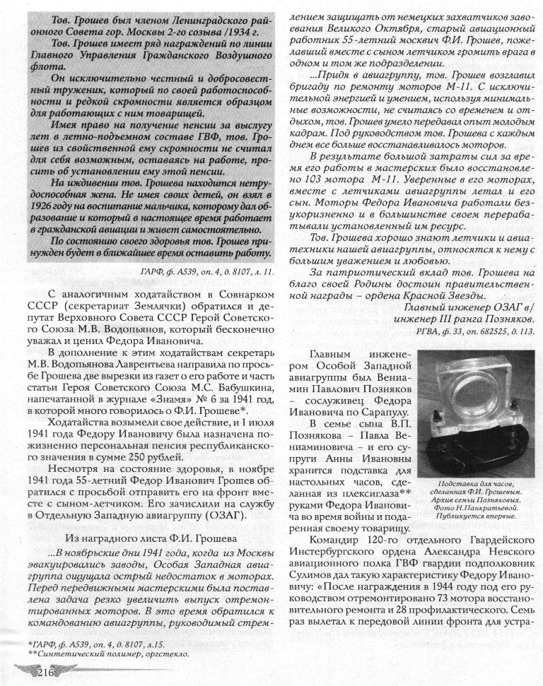 нения неисправностей в моторах М-17 и М-62 на самолётах, выполнявших боевые задания. Возвращаясь из тыла противника, самолеты с подбитыми моторами производили посадку, едва перетянув линию фронта. Тов. Грошев два раза вылетал для ремонта моторов, подвергаясь обстрелу со стороны противника. Работу выполнял отлично. Умело используя свой многолетний практический опыт, выносит ценные рационализаторские предложения, применение которых дает большой эффект в деле замены недостающих запчастей (взамен венчика в бракованные носки картера ставит стальной фланец, производит ремонт негодных валиков магнето и др. ). Моторы, восстановленные Грошевым, зарекомендовали себя очень хорошо. Летчики с уверенностью выполняют задания, зная, что мотор не откажет в трудную минуту»... *