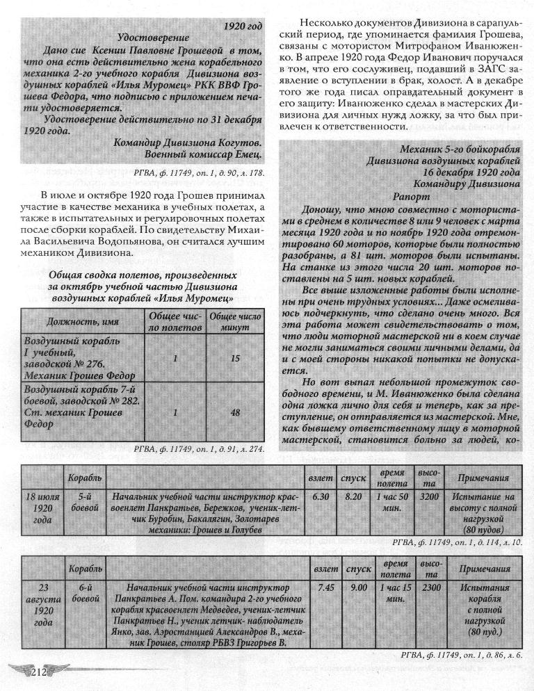 «Небольшого роста, коренастый, с черными усиками, он никогда не сидел без дела, все время возился у «Ильи Муромца». Говорил Грошев так быстро, что сразу и не поймешь», - эту портретную зарисовку механика сарапульских мастерских при ДВК «Илья Муромец» Федора Ивановича Грошева дал Михаил Васильевич Водопьянов.