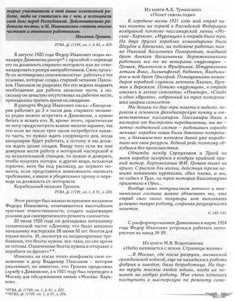 Тов. Грошев - один из старейших бортмехаников Советской Гражданской авиации, начавший службу еще в Эскадрилье тяжелых воздушных кораблей «Илья Муромец» и участвовавший с 1917 года по 1922 год в гражданской войне против Мамонтова, Деникина и Врангеля - в качестве корабельного механика тяжелых самолетов. С 1922 по 1924 год он летал в ВВС механиком на самолете «Викерс-Вими», с 1924 года тов. Грошев работает в Гражданском Воздушном флоте.