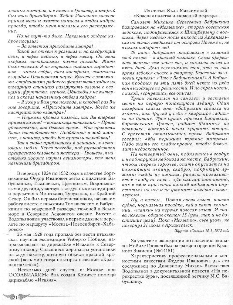 В дополнение к этим ходатайствам секретарь М. В. Водопьянова Лаврентьева направила по просьбе Грошева две вырезки из газет о его работе и часть статьи Героя Советского Союза М. С. Бабушкина, напечатанной в журнале «Знамя» № 6 за 1941 год, в которой много говорилось о Ф. И. Грошеве*.
