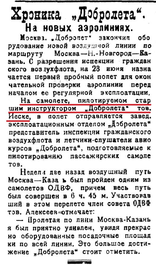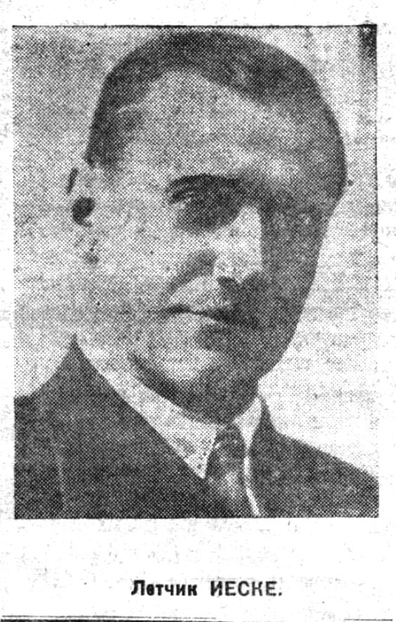 Пилот "Сибревкома", Николай Мартынович Иеске, — латыш. сын батрака. Начал летать, в качестве военного летчика, в 1915 году. До настоящего времени летает без перерыва. Кроме русских авиационных школ, получил подготовку за границей, в том числе кончил школу высшего пилотажа в Фоджиа (Италия). За тов. Иеске числится несколько рекордных перелетов: Турин - Вена, через Альпы, зимой над облаками на высоте 7 тыс. метров, 1.350 километров без посадки: Вена - Киев и обратно, 1.850 километров без посадки, через территорию 4-х враждебных стран — Польша, Чехо-Словакия, Венгрия, Австрия (1920 г.) и др.