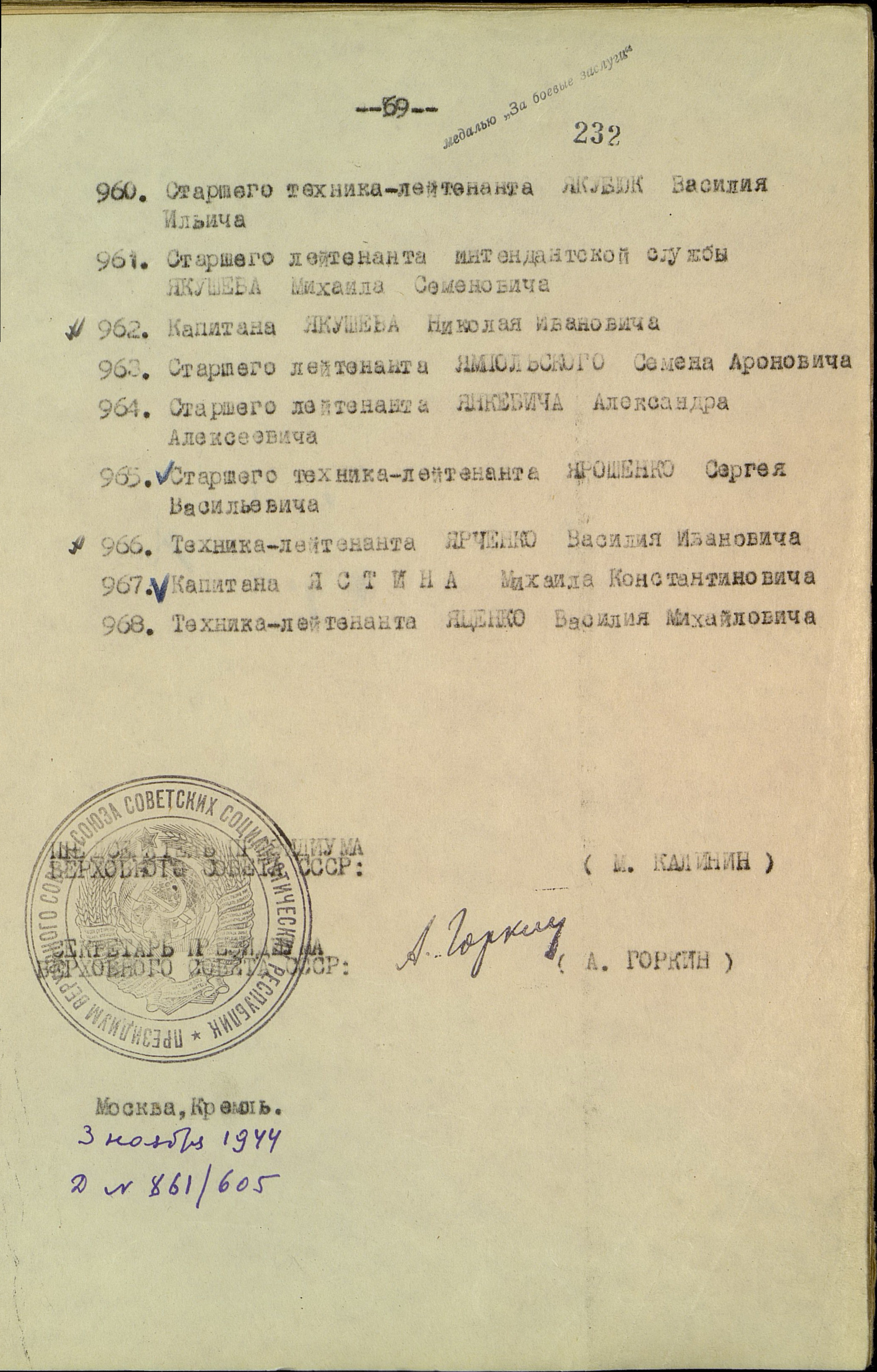 Наградной лист: фонд 3 опись 1 единица хранения 1144