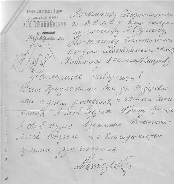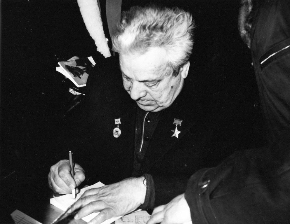 Сделав контрольный круг, самолет пошел на посадку. Наступил волнующий момент, замолкли двигатели, открылся люк и механик выпустил трап. Первым на лед сошел А.В. Ляпидевский. На нем был летный полушубок, на ногах традиционные унты. В то время ему было 70 лет, но выглядел он гораздо моложе. Чрезвычайно подвижный, с приятной улыбкой, Анатолий Васильевич подошел к нашей группе и поздоровался с каждым персонально. Чувствовалось, что он рад встрече с полярниками. Можно только представить, что я в это время испытывал, когда пожимал руку легендарному пилоту.