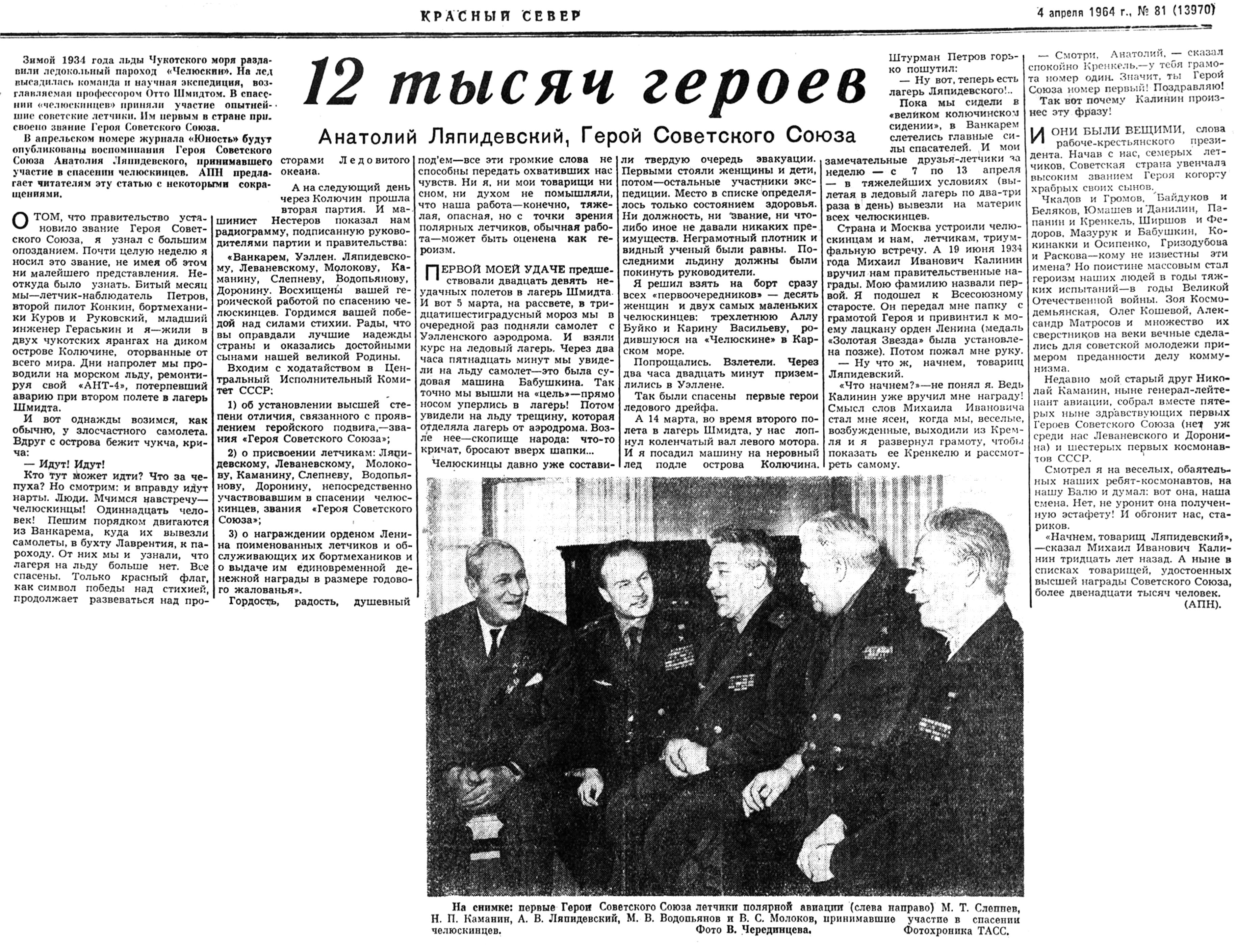 С Большой земли пришла радиограмма: в ближайшие дни на станцию прилетит Ан-12. Это будет технический рейс, на нем доставят топливо и почту для зимовщиков. И еще одна хорошая новость: с этим бортом прилетит первый Герой Советского Союза летчик А.В. Ляпидевский. Конечно, всем хотелось увидеться и пообщаться с кумиром нашего детства.