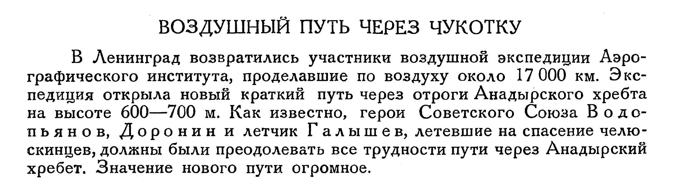 Корф телеграфирует из Нагаева 15 октября: „Выполняя задание Главсевморпути по исследованию и освоению воздушных путей района Охотское побережье —Чукотка, экспедицией на 15 октября выполнен производственный план на 170% и ранее срока на 20 дней. За три месяца полевых работ на протяжении 2300 км по маршруту Охотск — Нагаево — Анадырь экспедицией произведено: 1) выбор путем облетов направления для организации воздушных сообщений; 2) исследование с воздуха 17 гидропортов и гидроаэродромов с полным техническим оформлением их наземными партиями; 3) аэрофотосъемки ориентиров гидроаэродромов по трассе, сделано 920 аэроснимков; 4) заснято топографической съемкой в масштабе 100 м в 1 см (1: 10 000) 130 км; 5) перекрытие сплошным детальным промером глубин 50 км; 6) общий налет за 18 дней 115 часов 17500 км. На основе произведенных исследований, собранных картографических, экономических, гидрологических и прочих материалов Аэрографическим институтом будут составлены полетные карты, аэролоции и аэрографические описания, что в дальнейшем облегчит безопасность самолетовождения и окончательно закрепит путь, пройденный героями Советского Союза. Во всех районах работ среди нацменов экспедицией проводилась общественно-политическая работа".