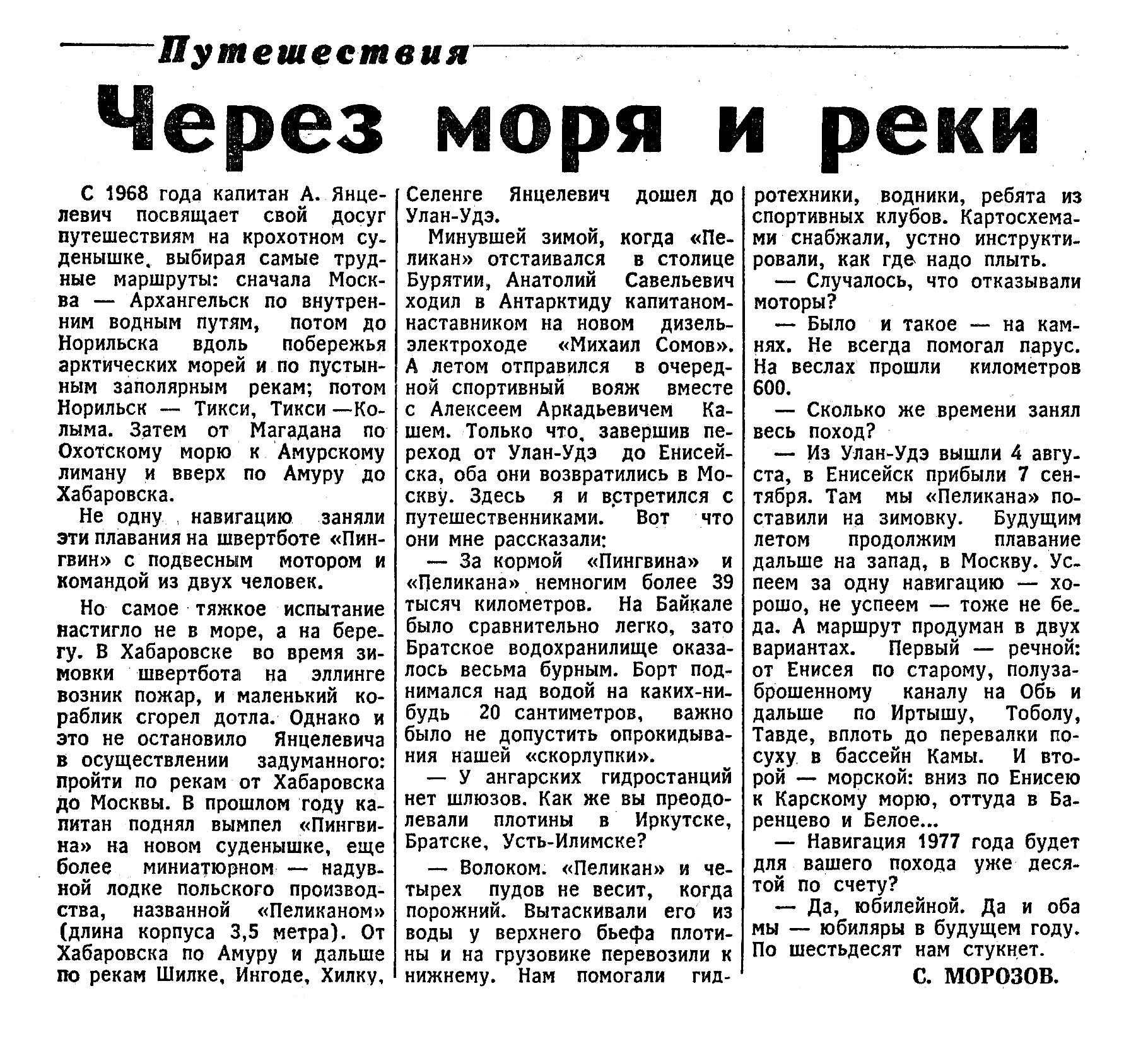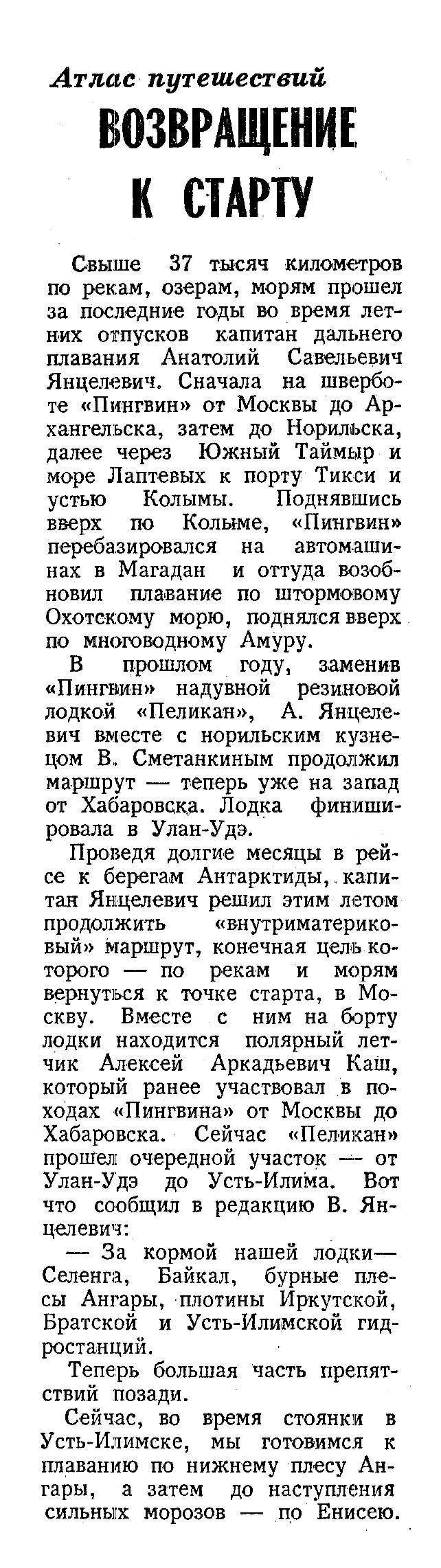 Свыше 37 тысяч километров по рекам, озерам, морям прошел за последние годы во время летних отпусков капитан дальнего плавания Анатолий Савельевич Янцелевич. Сначала на шверботе «Пингвин» от Москвы до Архангельска, затем до Норильска, далее через Южный Таймыр и море Лаптевых к порту Тикси и устью Колымы. Поднявшись вверх по Колыме, «Пингвин» перебазировался на автомашинах в Магадан и оттуда возобновил плавание по штормовому Охотскому морю, поднялся вверх по многоводному Амуру.