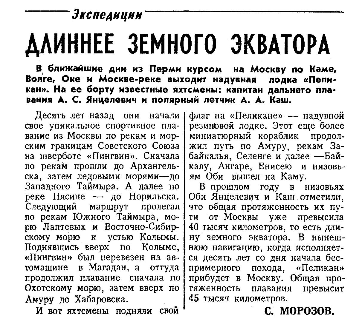 В ближайшие дни из Перми курсом на Москву по Каме, Волге, Оке и Москве-реке выходит надувная лодка «Пеликан». На ее борту известные яхтсмены: капитан дальнего плавания А. С. Янцелевич и полярный летчик А. А. Каш.