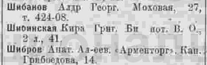 Шибинский Влад. Григ. К-ра "Комсеверпуть", Моховая, 18, кв.14, тел.168-83.
