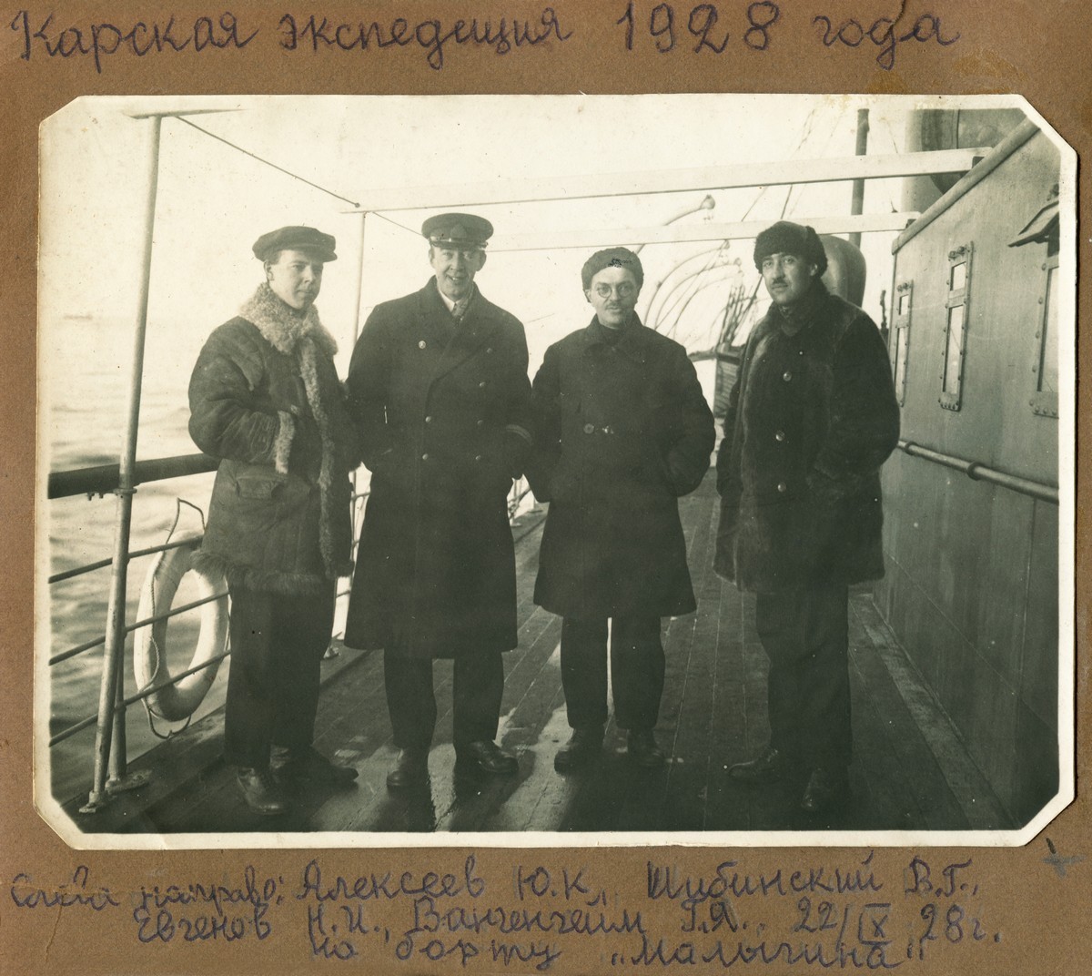 Руководство Карской экспедиции 1928 г. на борту "Малыгина". Слева направо: В.Г. Шибинский (пом. нач. экспедиции), Д.Т. Чертков (капитан), Н.И. Евгенов (нач. экспедиции), Г.Я. Вангенгейм (метеоролог).