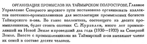 ОРГАНИЗАЦИЯ ПРОМЫСЛОВ НА ТАЙМЫРСКОМ ПОЛУОСТРОВЕ. Главное Управление Северного морского пути постановило организовать коллектив охотников-промышленников для эксплоатации промысловых богатств Таймырского п-ова. Во главе коллектива, состоящего из десяти промышленников, будет стоять охотник С. Журавлев, много лет промышлявший на Новой Земле и проведший два года (1930—1932) на Северной Земле. Вместе с промышленниками на Таймырский п-ов выезжают члены их семей в составе десяти человек.