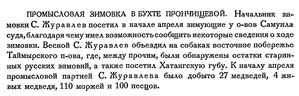 ПРОМЫСЛОВАЯ ЗИМОВКА В БУХТЕ ПРОНЧИЩЕВОЙ. Начальник зимовки С. Журавлев посетил в начале апреля зимующие у о-вов Самуила суда, благодаря чему имел возможность сообщить некоторые сведения о ходе зимовки. Весной С. Журавлев объездил на собаках восточное побережье Таймырского п-ова, где, между прочим, были обнаружены остатки старинных русских зимовий, а также посетил Хатангскую губу. К началу апреля промысловой партией С. Журавлева было добыто 27 медведей, 4 живых медведя, 110 моржей и 100 песцов.
