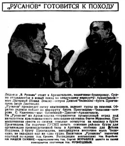На "Русанове" из Архангельска отправляется промысловый отряд под начальством краснознаменного зимовщика-охотника Сергея Журавлева. Промышленники вместе со своими семьями останутся на зимовку в бухте Прончищева. Им поручено ГУСМП начать освоение районов бухты для организации производственной базы в Арктике, особенно для района Нордвика. В бухту Прончищева, находящуюся восточнее мыса Челюскин, не заходило еще ни одно судно. Капитаном "Русанова" назначая опытный полярник тов. Ерохин. Экспедицию возглавляет тов. Воробьев.