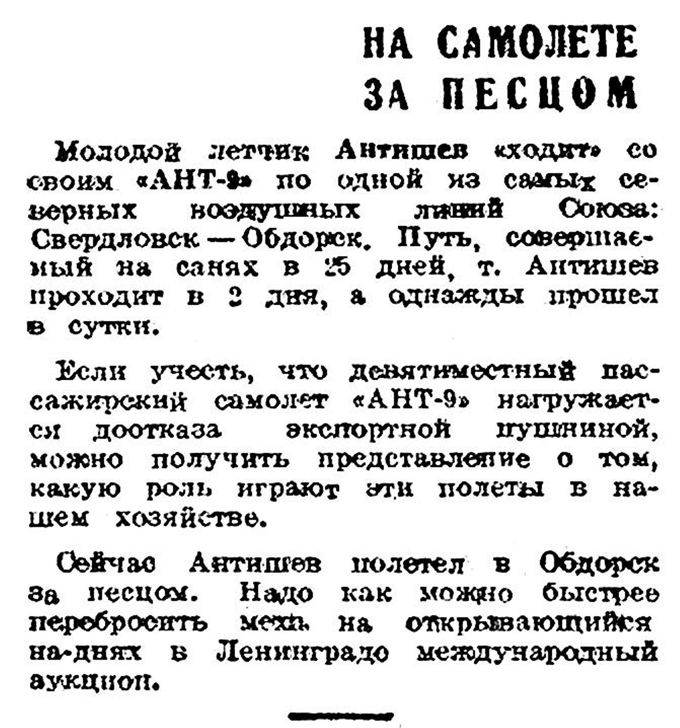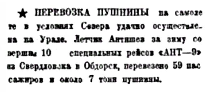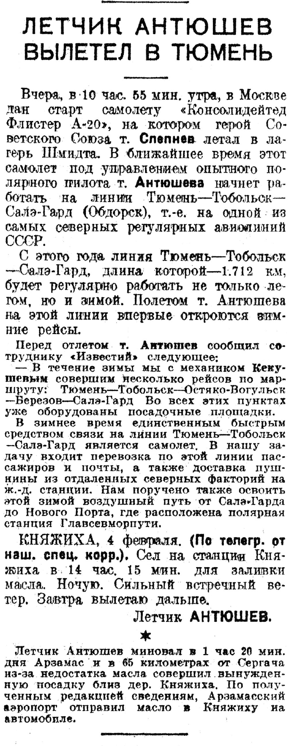 Известия, 1935, №31 (5584), 5 февраляЛЕТЧИК АНТЮШЕВ ВЫЛЕТЕЛ В ТЮМЕНЬ