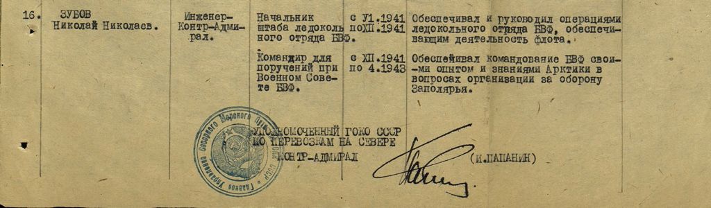 В начале второй мировой войны Московский гидрометеорологический институт был эвакуирован в глубокий тыл — Среднюю Азию. Николай Николаевич Зубов остался в Москве, На все предложения отправиться вместе с Институтом он отвечал категорическим отказом. Он хотел оказать реальную помощь в защите родины. Но где применить ему свои знания? Конечно, на флоте, решает Зубов. Он подает заявление с просьбой о добровольном зачислении в ряды военно-морского флота. После настойчивых просьб н ходатайств профессора Зубова зачисляют во флот в звании капитана второго ранга. В таком звании он закончил службу в царском флоте. Но тогда он был боевым командиром корабля. 24 года, прошедших с тех пор, Зубов плавал на экспедиционных судах в качестве ученого-океанолога, и командование военно-морским флотом призвало его для службы на флоте как знатока морских льдов. Его направили в Архангельск, в штаб ледокольного отряда Беломорской флотилии Северного флота.